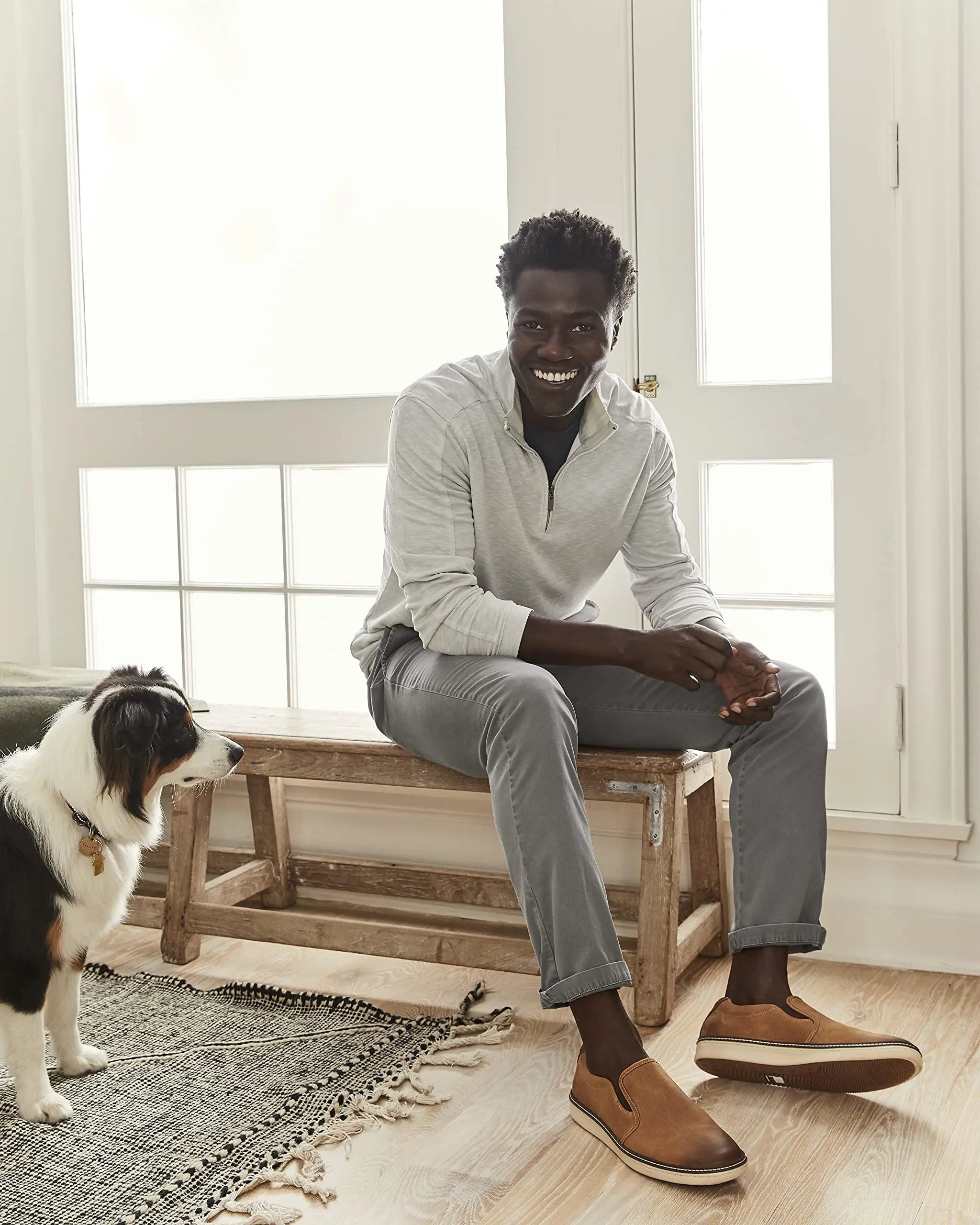 The Mens McGuffey Leather Slip-On Shoe is crafted with extra-soft, oiled full-grain leather, a rubber sole, and skeletal leather lining for soft, unconstructed feel.