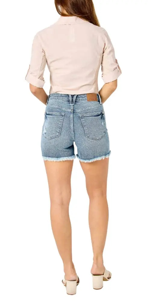 - PERFECT FIT: Style up your summer with these new Judy Blue High Waist Button Fly Destroy Hi-Lo Hem Shorts! PERFECT for those hot summer days! We are size inclusive, which means - Made for Every Body - Great jeans for all women. Period.