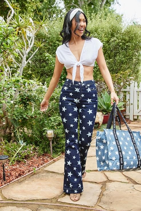 Elevate your denim collection with the Judy Blue High Waist Star Print Flare Jeans, a perfect blend of style, comfort, and functionality. Designed for those who appreciate a bold yet classic look, these jeans are a statement piece that stands out with their unique star print pattern and vintage-inspired silhouette. The first thing you’ll notice about these jeans is their eye-catching design. The star print adds a playful touch, making these jeans an ideal choice for anyone who loves to stand out in a crowd. Whether you’re heading to a music festival, meeting up with friends, or simply looking to add a bit of flair to your everyday wardrobe, the star print offers a unique aesthetic that’s both trendy and timeless. It brings a youthful, creative vibe to your outfit, perfect for expressing your personal style. Not only do these jeans look great, but they also offer a flattering high-rise fit. The high waist is designed to sit comfortably above the hips, enhancing your curves and creating a streamlined silhouette. This design is particularly great for elongating the legs, giving you a tall and lean appearance. It’s a classic fit that works well on all body types, offering both comfort and confidence.