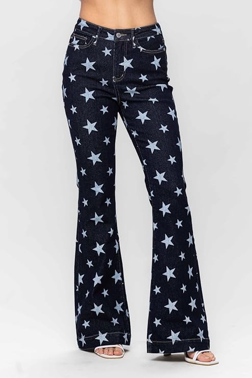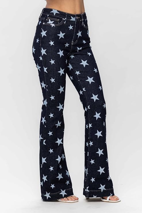 - Stylish Star Print Design: These Judy Blue High Waist Flare Jeans feature an eye-catching star print, perfect for creating a bold and trendy look. The unique design adds an extra layer of charm, giving these jeans a playful yet fashionable vibe. Whether you’re pairing them with a simple top or layering with outerwear, the star print makes them stand out, making these jeans a must-have for fashion-forward wardrobes.