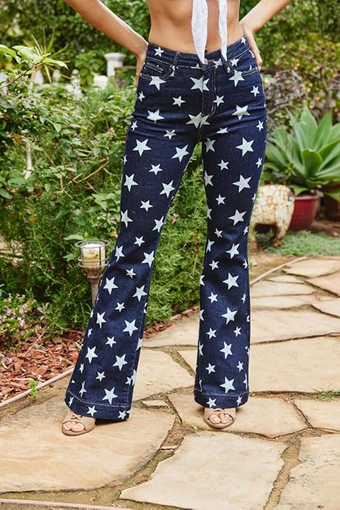 - Perfect for Versatile Styling: These star print flare jeans are incredibly versatile, allowing you to dress them up or down effortlessly. Whether you pair them with a fitted blouse and heels for a polished look or a graphic tee and sneakers for a casual vibe, they will seamlessly fit into any occasion. Their unique design and timeless silhouette make them a standout piece in any wardrobe, offering endless possibilities for creative styling.