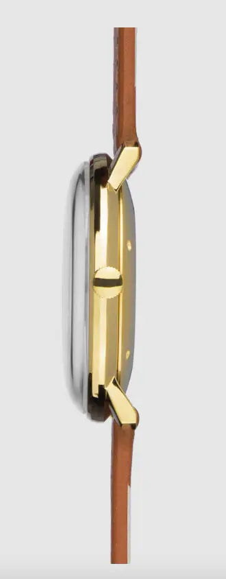 - Gold PVD stainless steel case with a brown leather band.