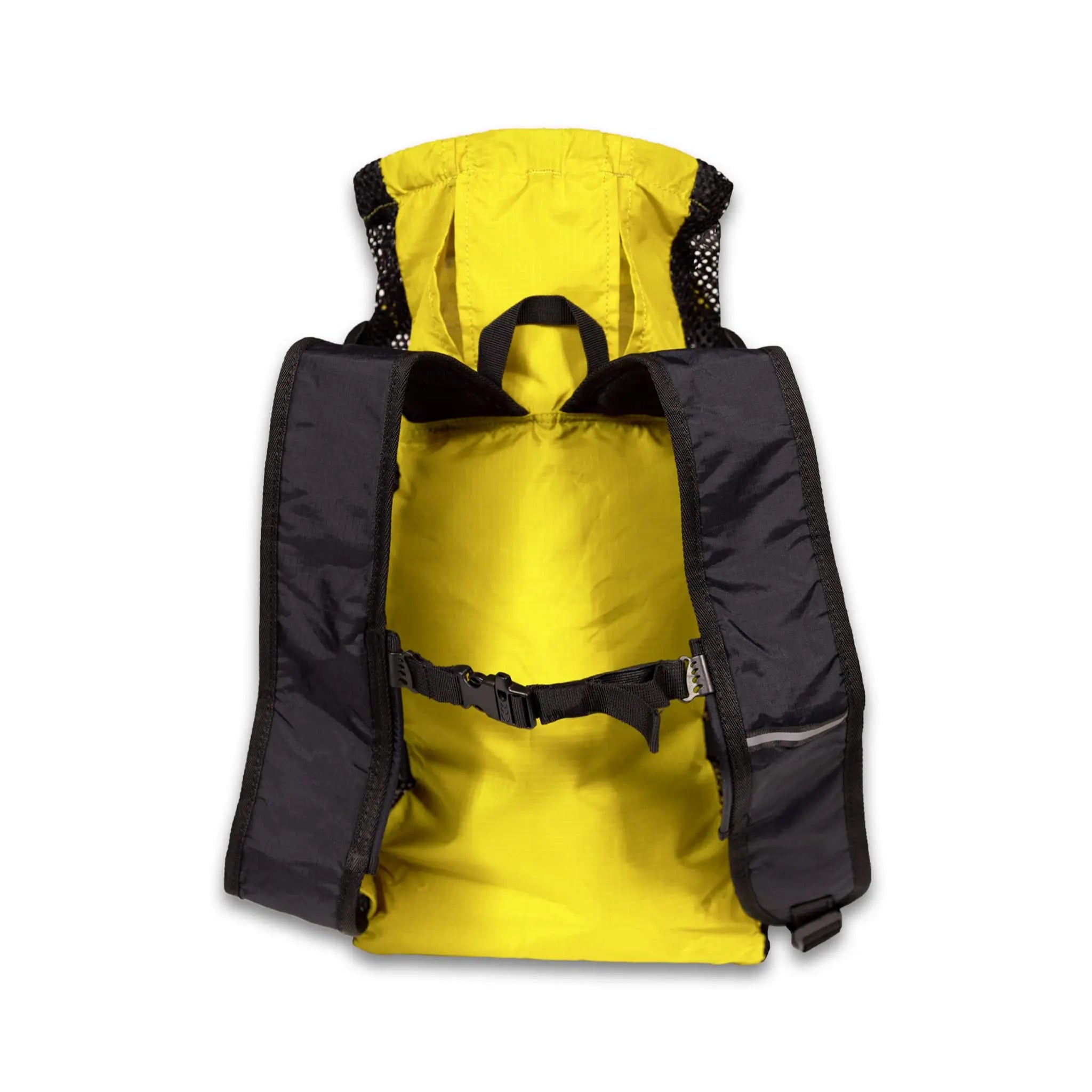The Walk-On is a lightweight, packable backpack dog carrier, with a compatible harness and storage bag made for small to medium sized dogs.