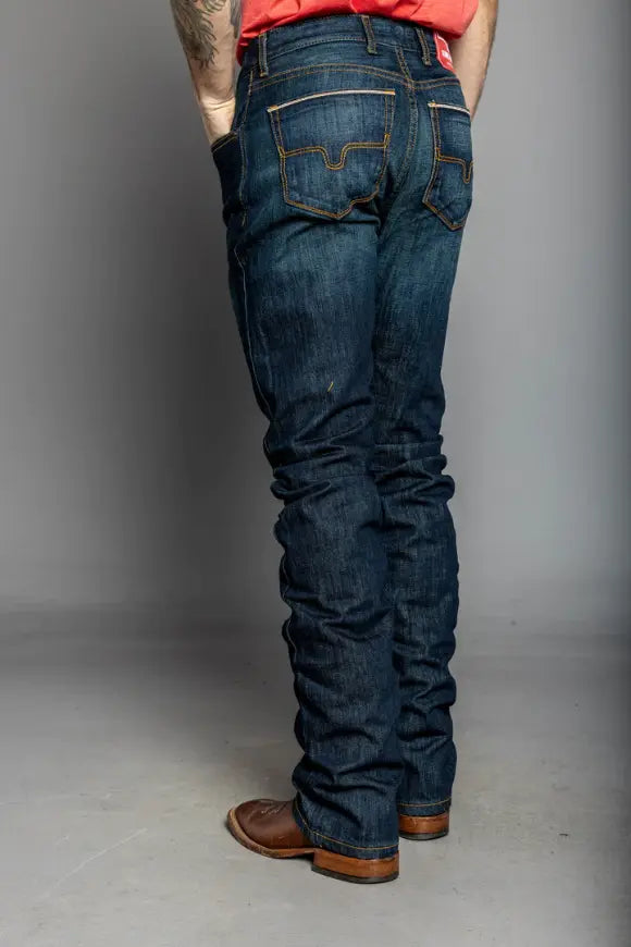 The dark 13 oz denim features 1% spandex for all day wear and rebound, hand sanding with whisker details and rear pocket details.