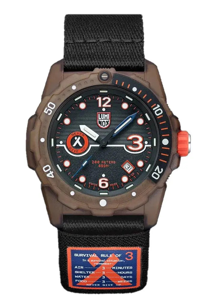 The watch is designed in striking blue and orange with an emphasis on 3 with an enlarged numeral in Super-Luminova glow.