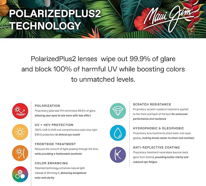 - All Maui Jim sunglasses feature PolarizedPlus2 lens technology that go beyond shielding your eyes from glare and harmful UV rays by enhancing colors to reveal the true beauty of the world around you