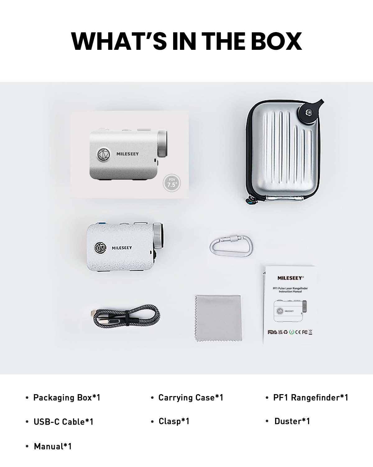 - Must-Have Golf Accessory: The PF1 is powered by an 800 mAh rechargeable lithium battery, provides a runtime of up to 5 hours and gives up to 15,000 measurements. The cutting-edge USB-C charging port supports multiple charging solutions - a power bank, car power, and outdoor power. Whats in the box: 1* PF1 rangefinder,1* manual.1* USB-C cable, 1* carrying box, 1*duster, 1*clasp. MILESEEY always provide 2-year unconditional warranty and lifetime technical support for its golf range finders.