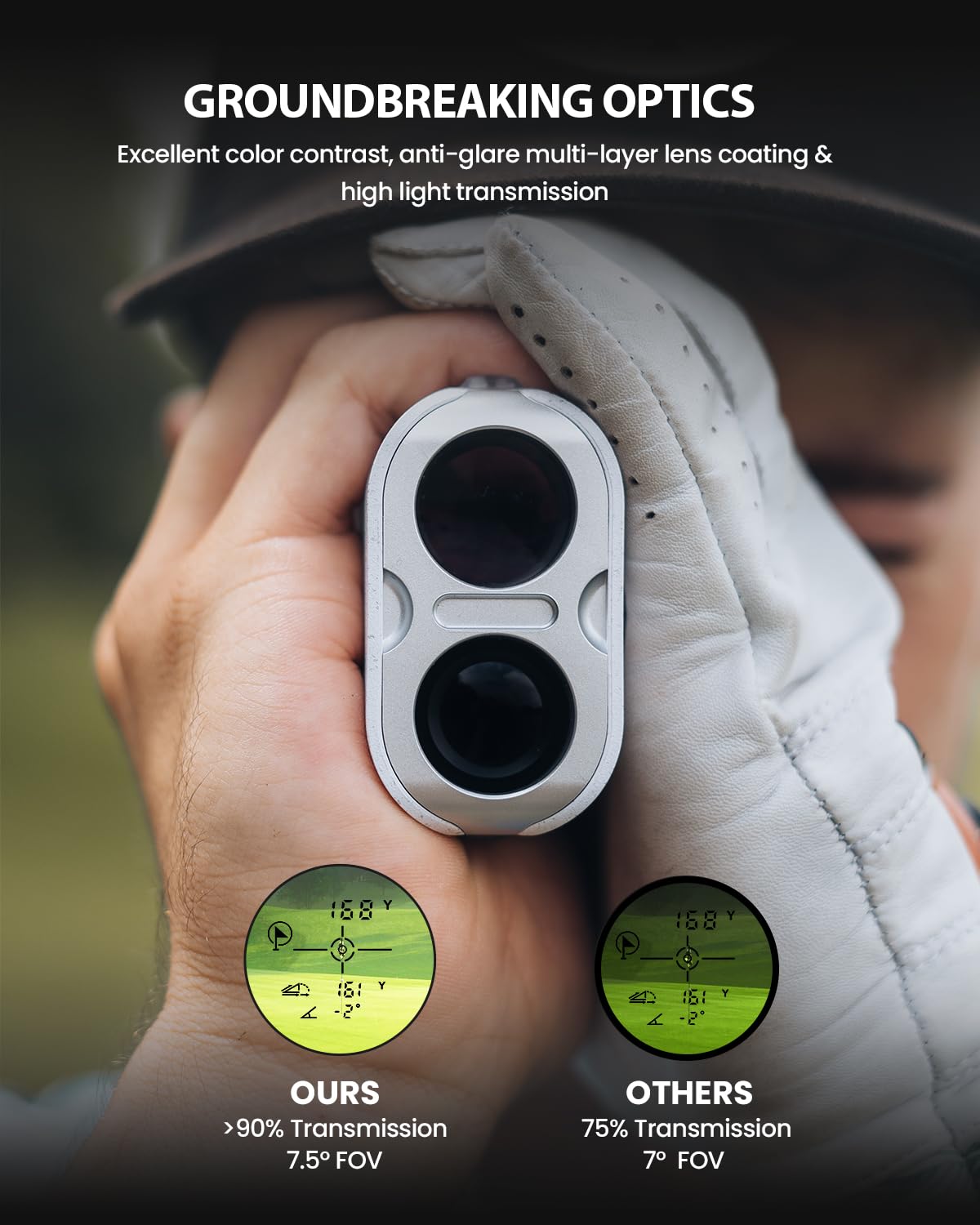 - Groundbreaking Optical Performance: with a lens system boasting a record-breaking high light transmission of over 90%, excellent color contrast, and anti-glare multi-coating, 6x magnification, PF1 makes measurements comfortably visible on its bright crystal-clear LCD display, and delivers remarkably sharp and crisp image even in adverse weather conditions. With a 7.5wide field of view, PF1 provides a much wider and clearer perspective and changes the way you see the course.