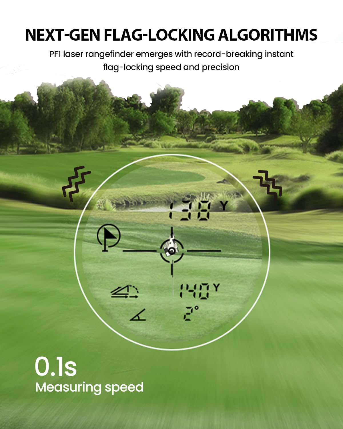 - 0.1s Instant Response:With next-gen flag-locking algorithms based on years of research by our engineers, the tour-proven PF1 laser rangefinder boasts record-breaking instant flag-locking speed and precision. Additionally, It provides up to 1000 yard range (300+ yards to a flag). You are guaranteed the best precision and consistent flag-locking rate, even with a shaky hand or a swing flag in the wind.