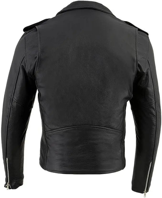 - Featuring a zip-up collar, our men's leather jacket is easy to take on and off. It suitable for all-seasons and all-weather conditions. Whether you're riding in the fall or summer season, Brando jacket will keep you warm and dry. Our black leather jacket is the perfect choice for adult riders who want to elevate their look and can stand through the harsh weather elements.
