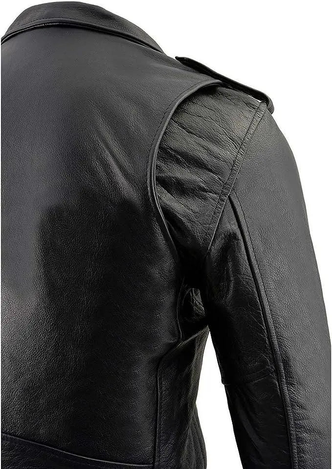 • The jacket is made of premium milled 1.2-1.3mm cowhide leather with a classic biker throwback look, featuring a front zipper closure with a built-in half belt for easy adjustment, snap down shoulder straps, snap down lapel collars, and silver color hardware. The hardware used is genuine YKK zippers known for their longevity and durability.