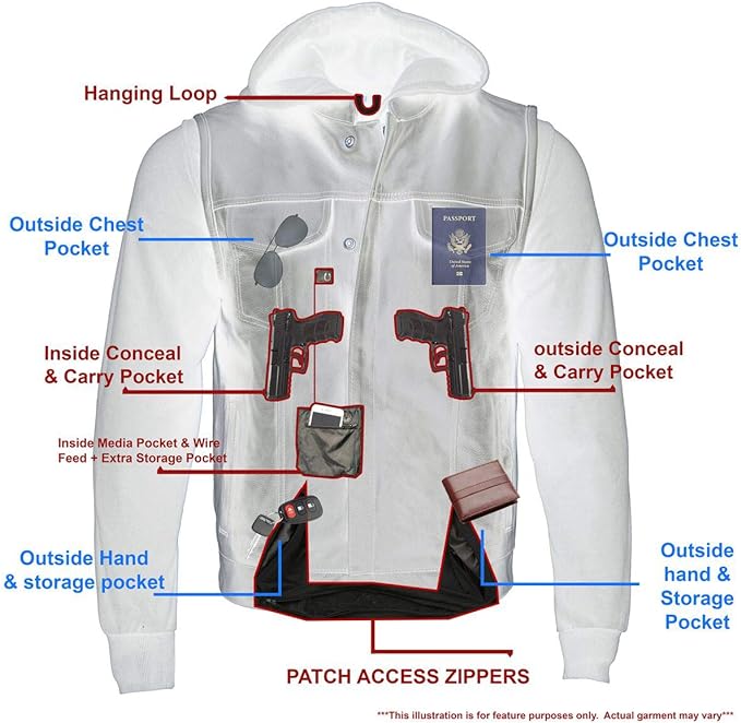 - This biker vest is designed with concealed carry 2-gun pocket functionality in mind. It features strategically placed pockets with secure closures, allowing you to discreetly carry your protection while maintaining a sleek and stylish look. Our vest features 2 front chest flap conceal carry and 2 outside lower drop storage pockets, allowing you to securely store and easily access small items like keys, wallets and additionally media pocket for phone.