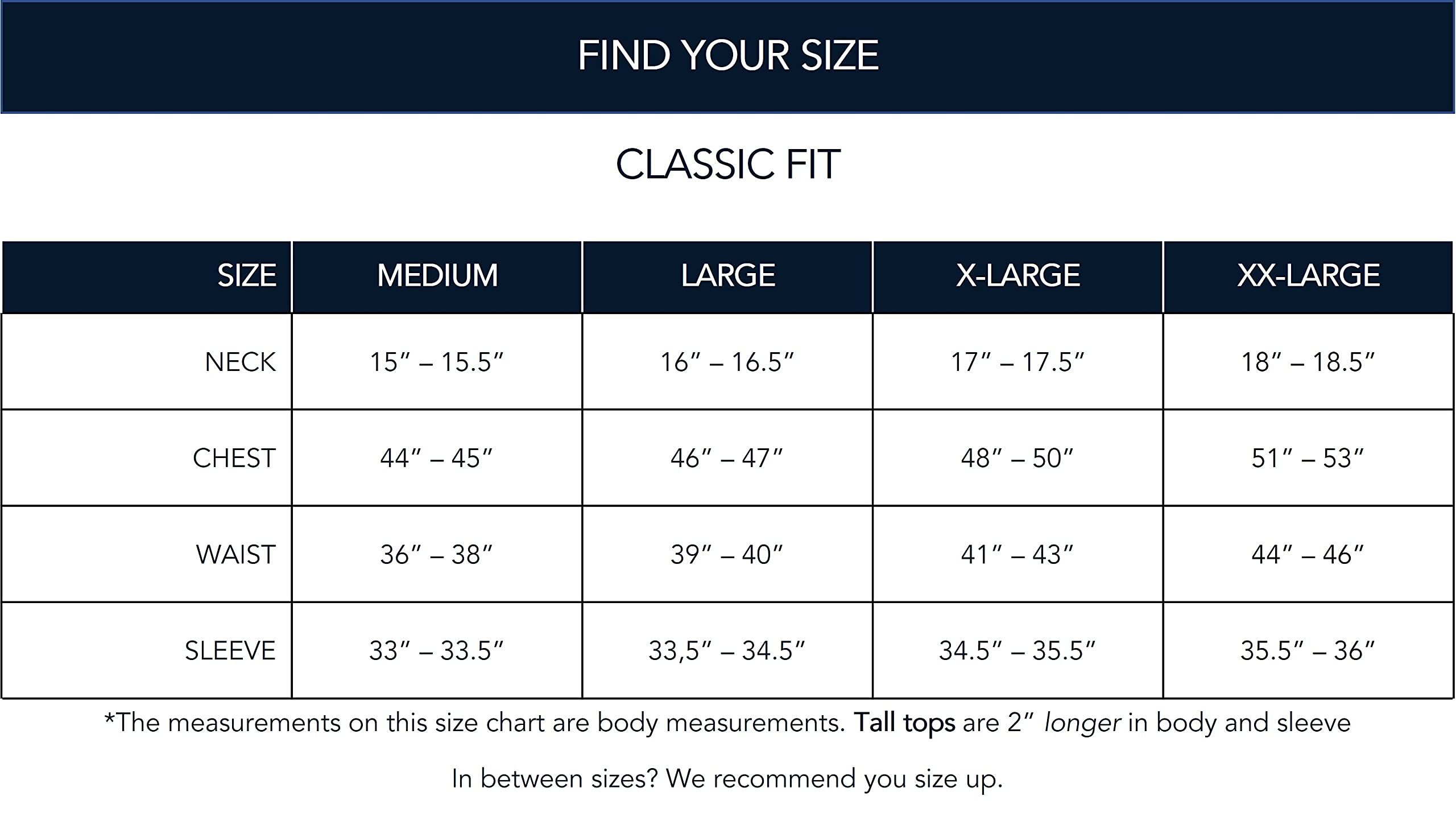 - CLASSIC FIT - Our Classic fit is a more relaxed cut and gives 4” of additional room in the body and arms.