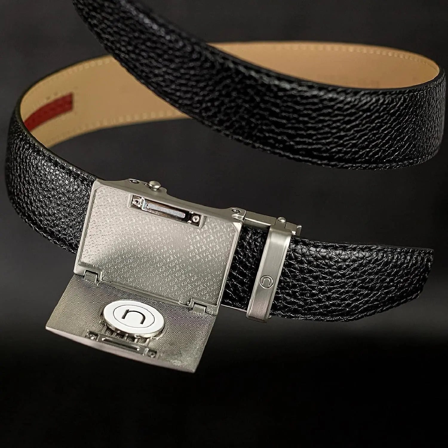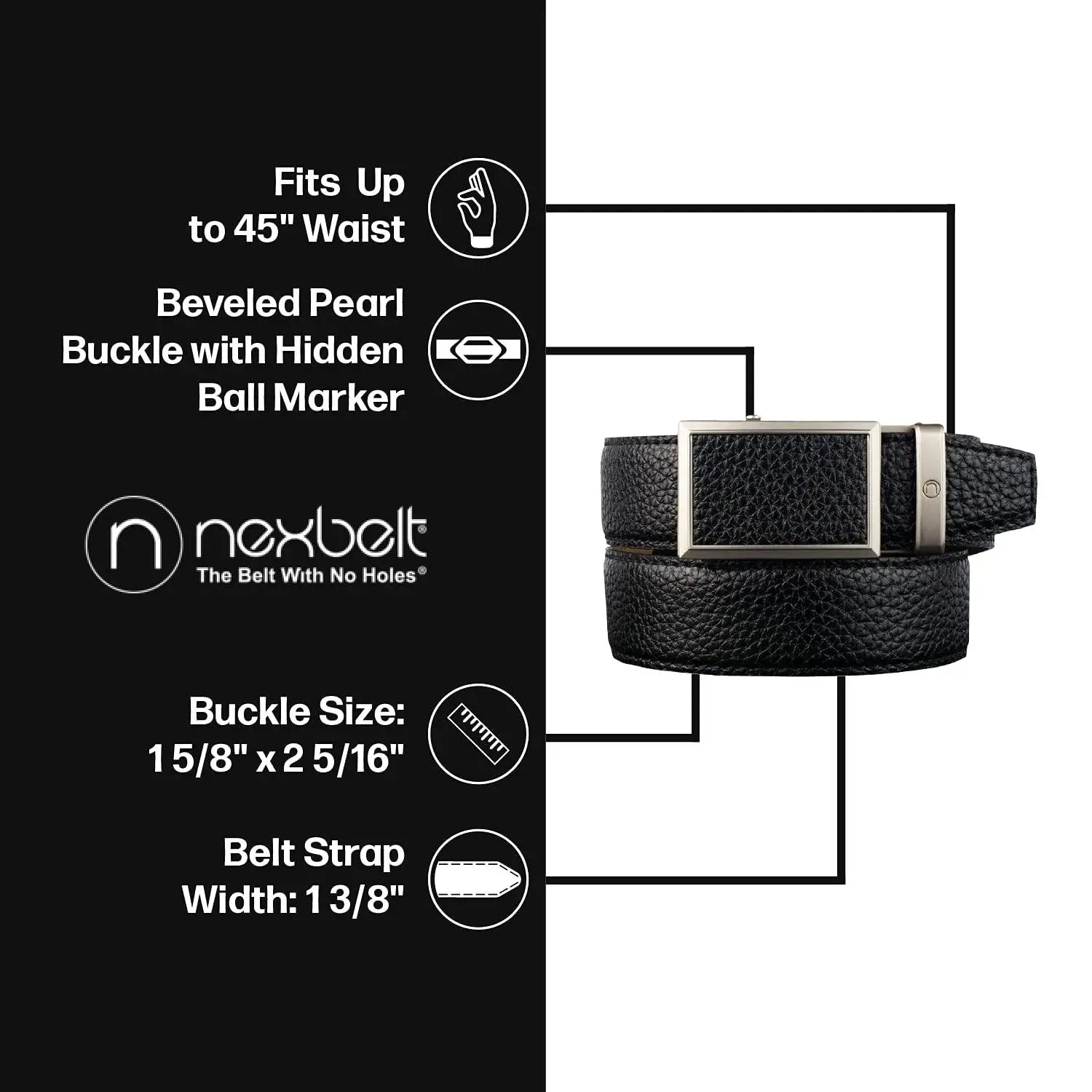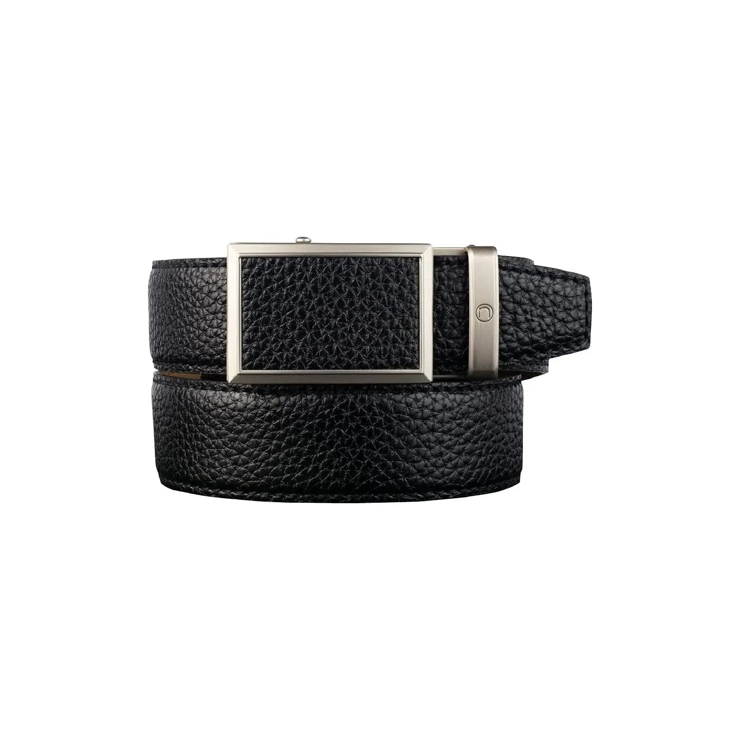 The pewter finish gives the buckle a sedate look which allows the beautifully crafted leather pebble grain straps with contrast stitching to really stand out.