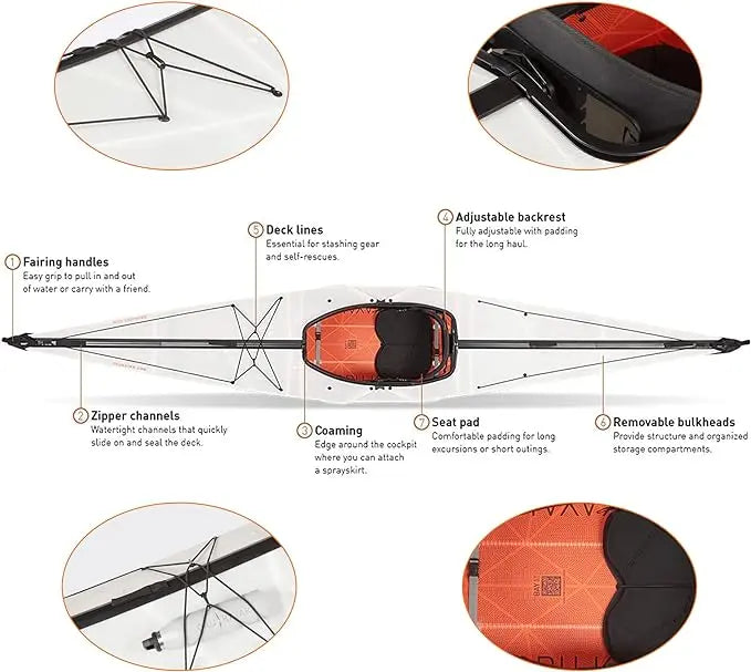 - All The Essentials For Any Pro: Oru Fiberglass Paddle - with asymmetrical blade for a high-performance pull through the water and breaks down into four pieces for easy storage. Gel Seat - an EVA foam upper and gel insert below molds to your body shape to provide comfort. Oru Pack - made of rugged heavy-duty nylon, with a comfortable shoulder and hip strap system. Float Bags - Made of abrasion and puncture-resistant coated nylon. Oru 24 oz Water Bottle - with double-wall insulation.
