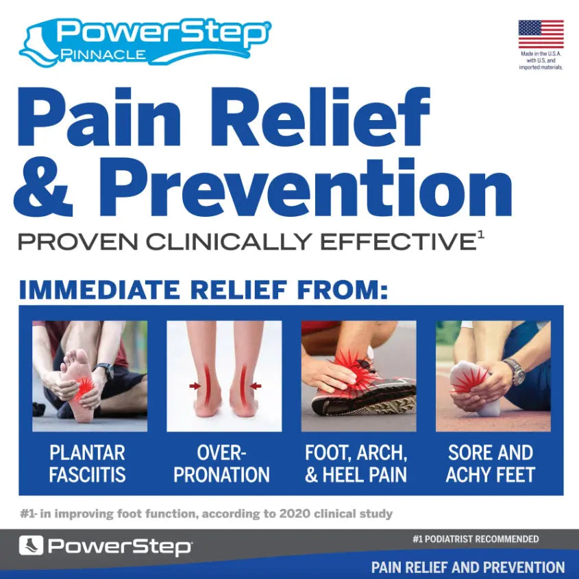 Powerstep Pinnacle Shoe Insoles are proven to relieve pain from Plantar Fasciitis. The Powerstep Arch Support was designed by a Podiatrist specifically to relieve pain, add support and comfort. Powerstep insoles are the #1 Podiatrist recommended show inserts for Men and Women in the US. (Clinical Study)