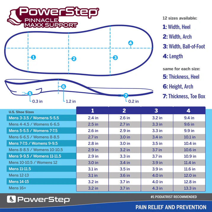 Powerstep Pinnacle Maxx Shoe Insoles are proven to relieve pain from Plantar Fasciitis. The Pinnacle Maxx features the signature PowerStep arch shape but with a firmer shell and an angled heel platform. These orthotic insoles for overpronation help keep the feet from rolling inward, improving motion control and maximizing stability. Built-in neutral arch support and dual layer cushioning offer perfectly balanced comfort and support. The Pinnacle Maxx Support insoles cradle the arch and heel, adding stability plus control and limiting excess stress on feet, ankles, joints, and tendons.