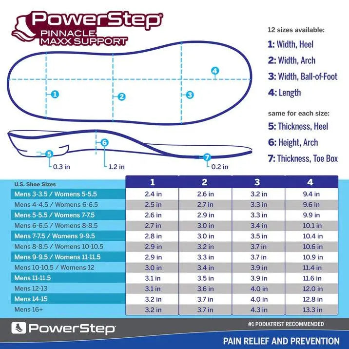 Powerstep Pinnacle Maxx Shoe Insoles are proven to relieve pain from Plantar Fasciitis. The Pinnacle Maxx features the signature PowerStep arch shape but with a firmer shell and an angled heel platform. These orthotic insoles for overpronation help keep the feet from rolling inward, improving motion control and maximizing stability. Built-in neutral arch support and dual layer cushioning offer perfectly balanced comfort and support. The Pinnacle Maxx Support insoles cradle the arch and heel, adding stability plus control and limiting excess stress on feet, ankles, joints, and tendons.