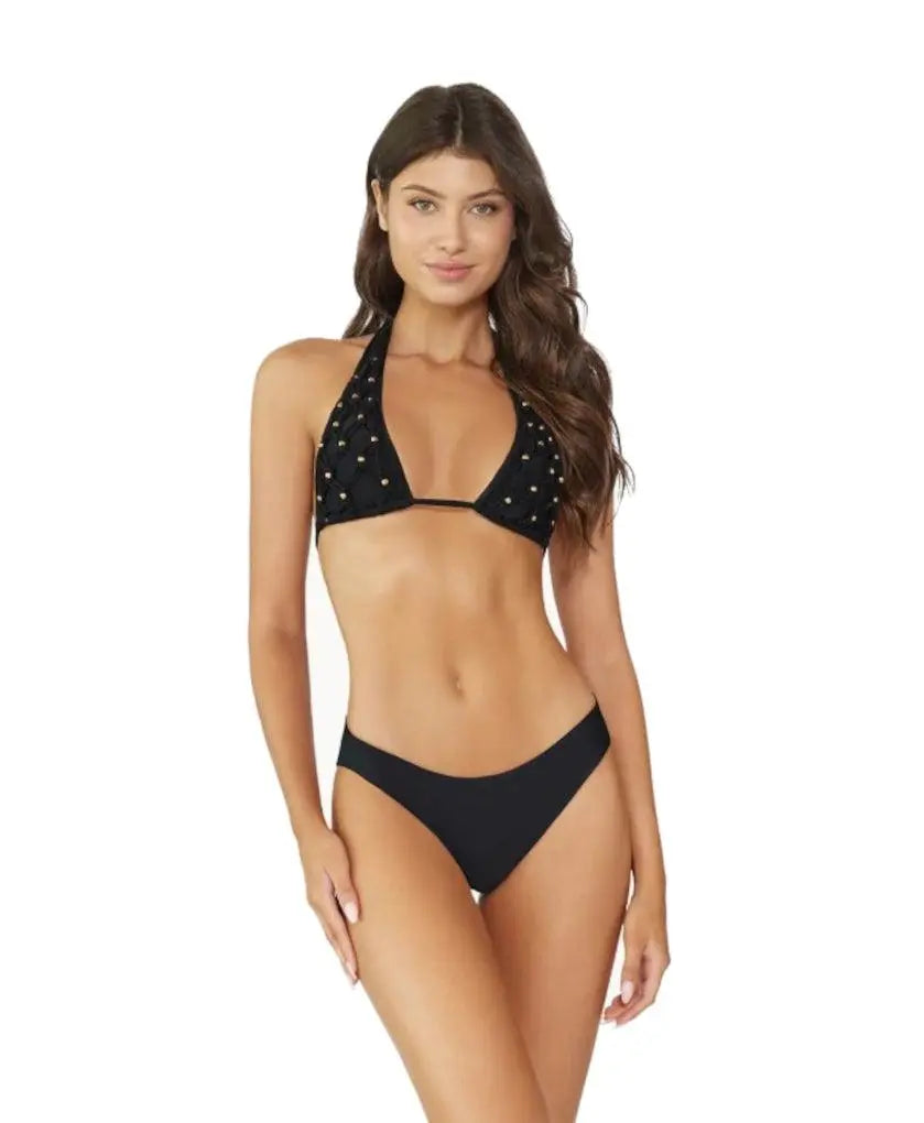 Introducing our black Beaded Brynn Halter bikini top, a stunning piece that exudes elegance and style. This top features a unique overlay of net macramé, adding an intricate and eye-catching detail to this top. The 24k gold-plated gold ball accessories further elevate the design, providing a sophisticated and luxurious sparkle. Crafted with care, this halter bikini top offers both comfort and fashion-forward appeal. Mix and match with other bottoms or complete the look with our Midnight Basic Ruched Bottoms. Includes removable padding.