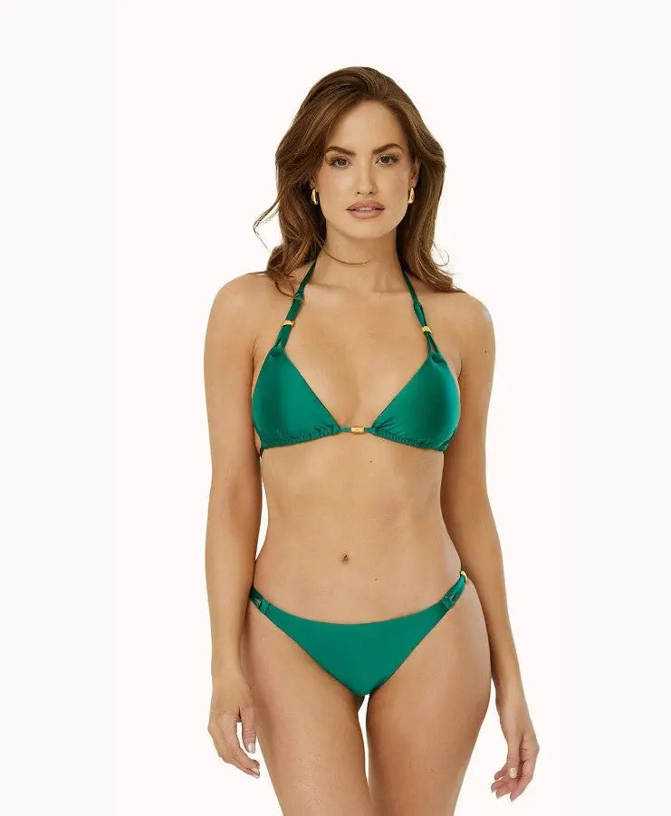 Make a statement with our Loop Bikini Bottom in stunning Evergreen, featuring eye-catching side loop details with 24k gold-plated accents for a touch of luxury. Its low-rise waistline and soft, stretchy fabric offer a flattering and comfortable fit.