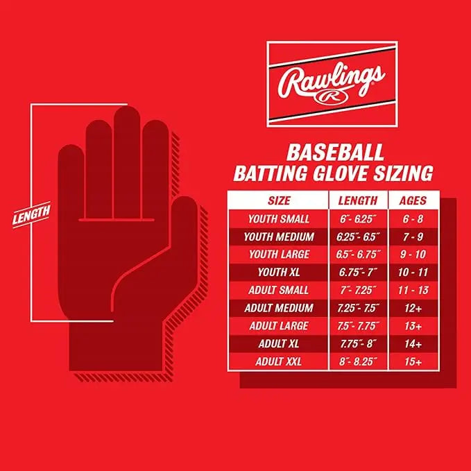 - INTRICATE DESIGN | Includes a one-piece neoprene cuff and thumb with an embossed Topo pattern strap ensuring a stylish look while keeping your hands secure. To match the overall look, the back of the batting gloves has a Lycra back-of-hand with Silicone print Topo pattern and Rawlings patch logo.