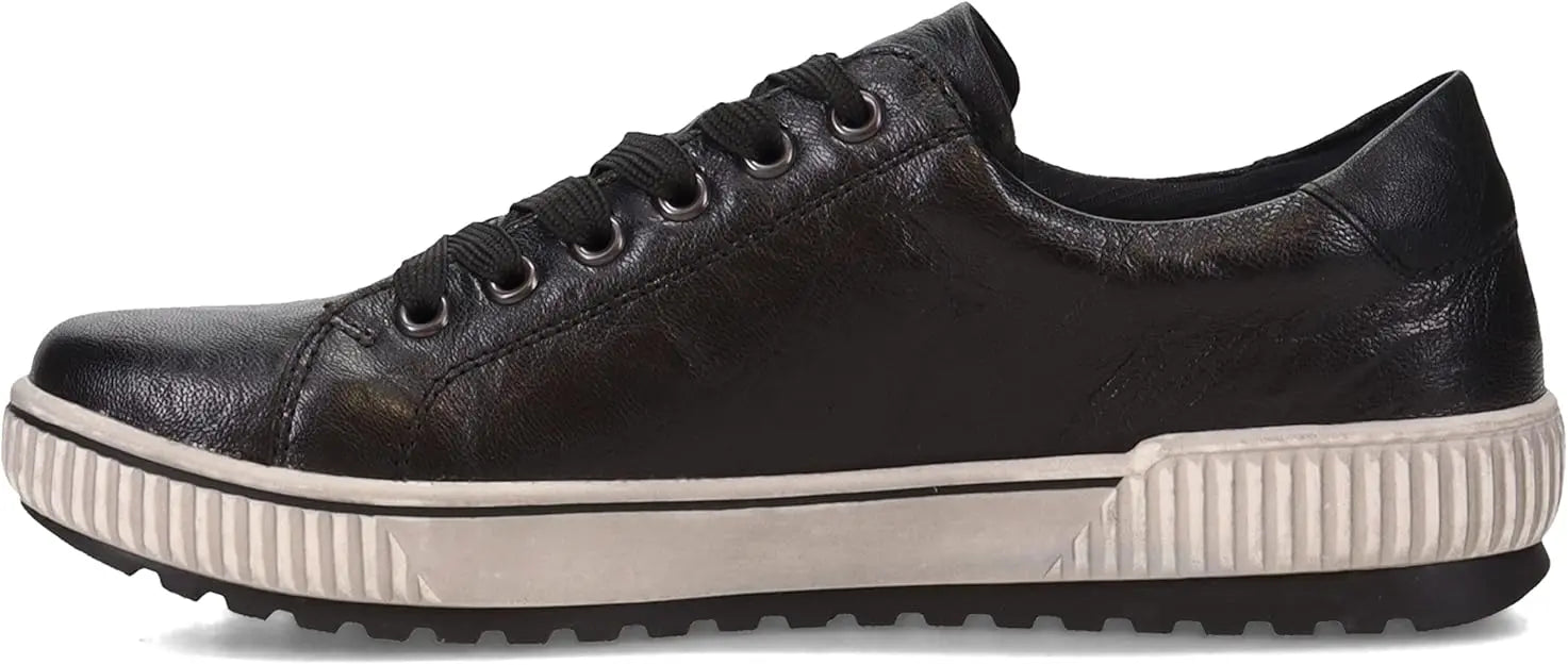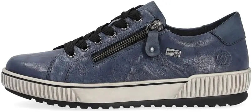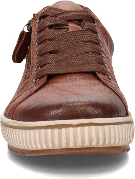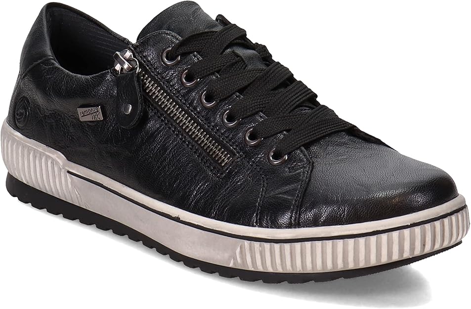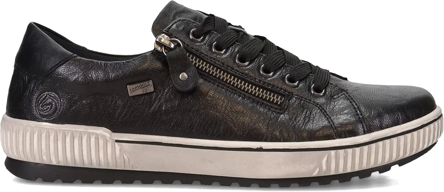 We love this sporty style from Remonte. The rich leather upper makes a statement paired with any outfit, and these shoes are guaranteed waterproof to keep your feet dry whatever the weather. The full lace-up front and side zip make them easy to get on and off, while the transverse flex sole gives the shoe flexibility in all directions. Leather and manmade uppers with water-resistant Tex membrane Lace up closure with side zipper for easy on and off Removable cushioned insole Sneaker style midsole with grippy traction outsole