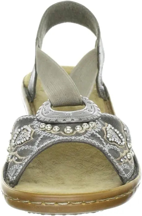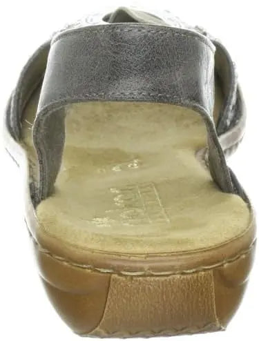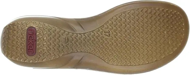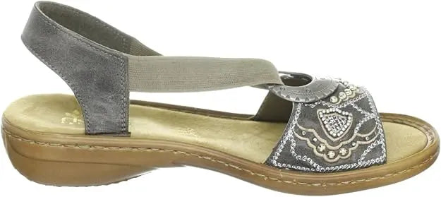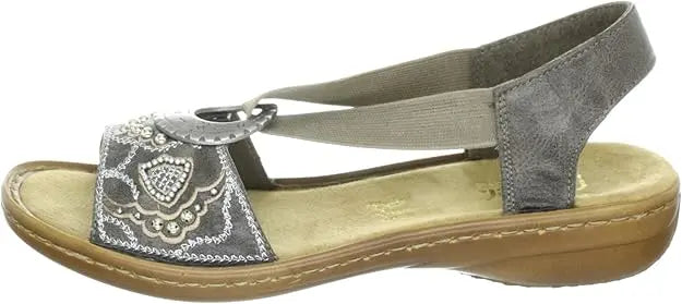 - Enjoy a modern silhouette with the Rieker 608B9 Regina B9 sandal. The leather upper features a delicate and colorful vamp design for a stunning visual display.
