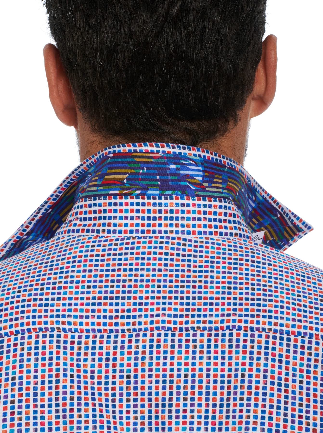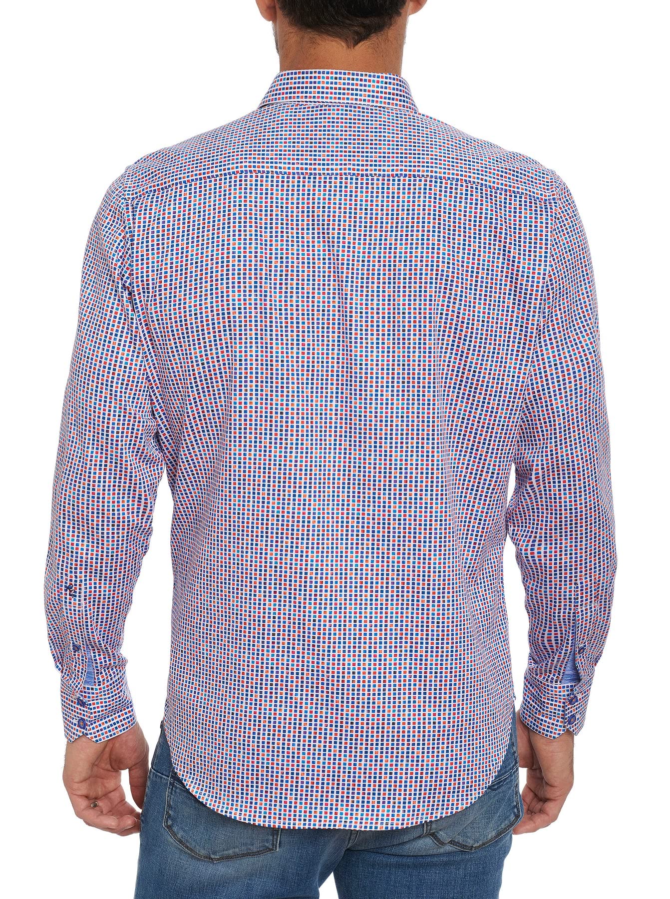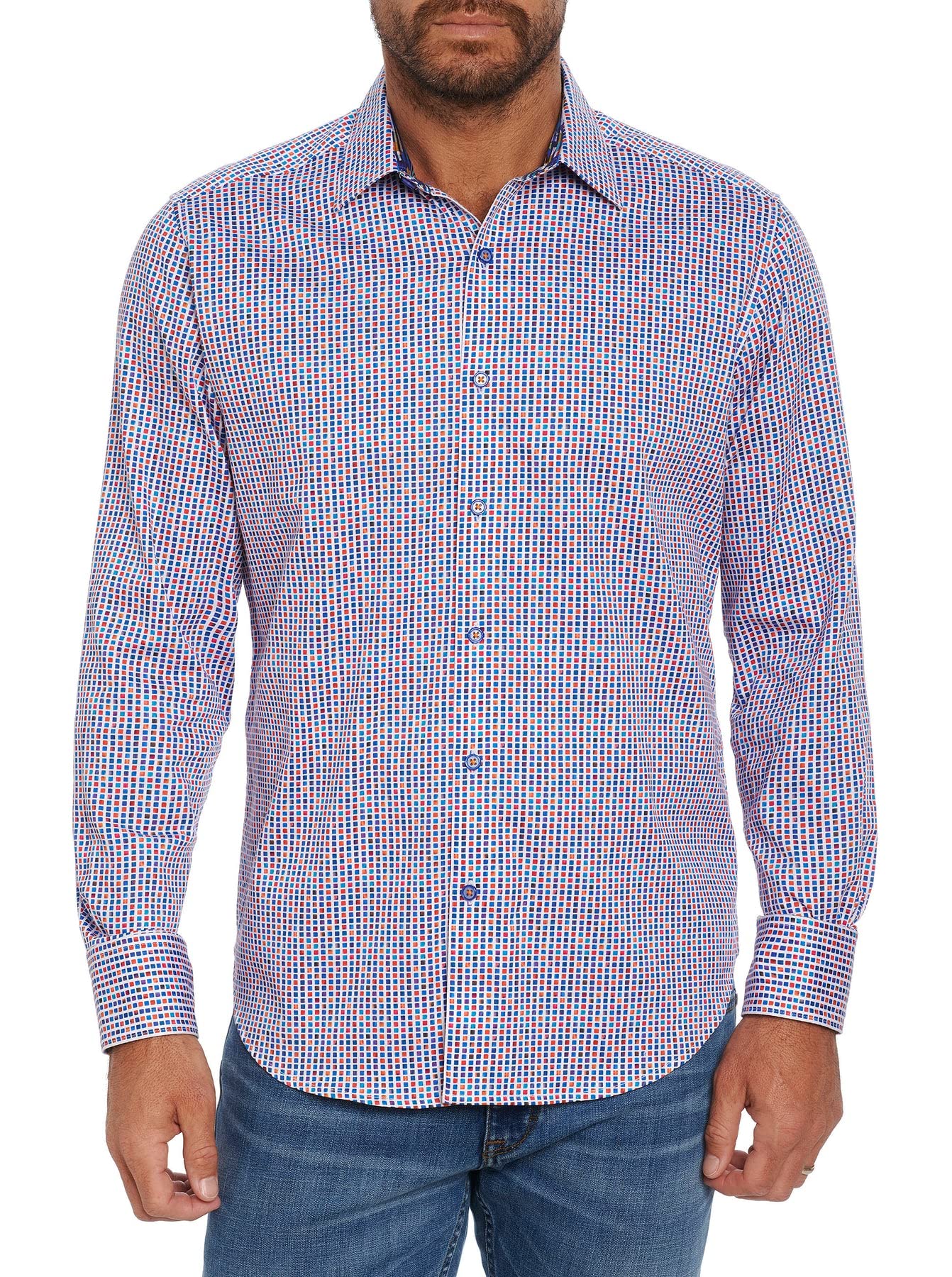 Navy and burnt orange mini squares around this stretch cotton long sleeve sport shirt.