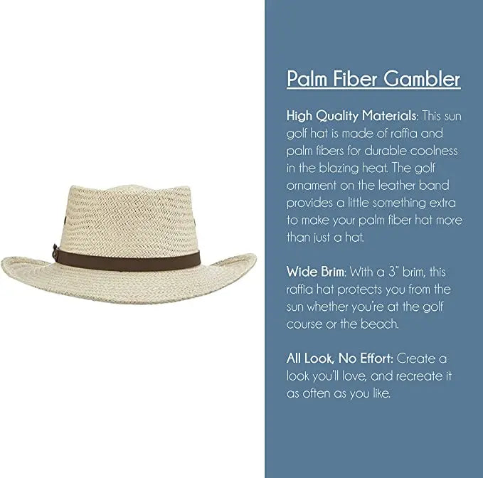 - Organic Raffia – This Dorfman Pacific sun golf hat is made of 100% raffia and palm fibers for durable coolness in the blazing heat. The golf ornament on the leather band provides a little something extra to make your palm fiber hat more than just a hat.