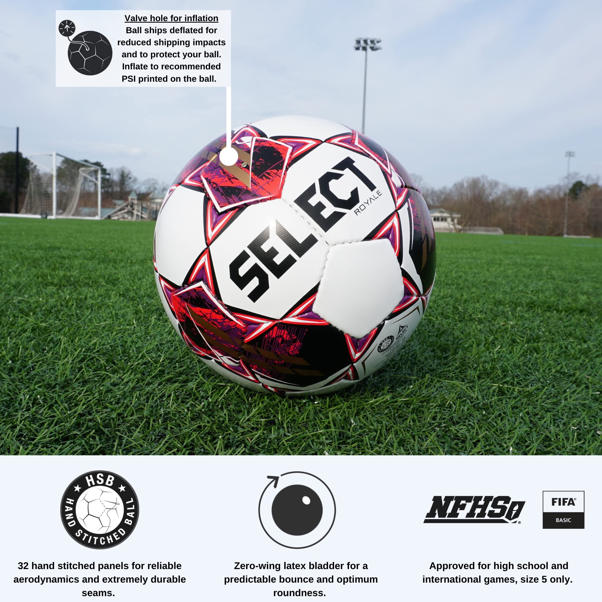 The Royale V22 soccer ball is an extremely durable match and training ball made of Japanese PU leather with a 32 hand-stitched panel design with textured structure for high friction, good control and a straight flight. You get a soft, firm, reliable and extremely durable soccer ball that competitors would double the price. The perfect match ball for club, college or high school. Value for the money. New 1.7 mm textured PU cover for improved feel and control Zero-wing latex bladder for optimal bounce 3 year stitching warranty FIFA Basic and NFHS approved