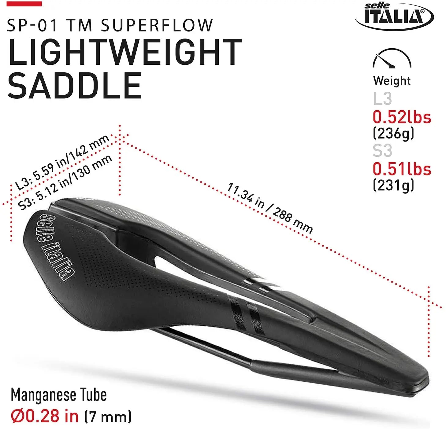 This SP-01 SuperFlow T-M bike road saddle is made with 7mm high strength and flexible manganese tube rails and is easy to install on nearly any bike, from road bikes to mountain bikes.