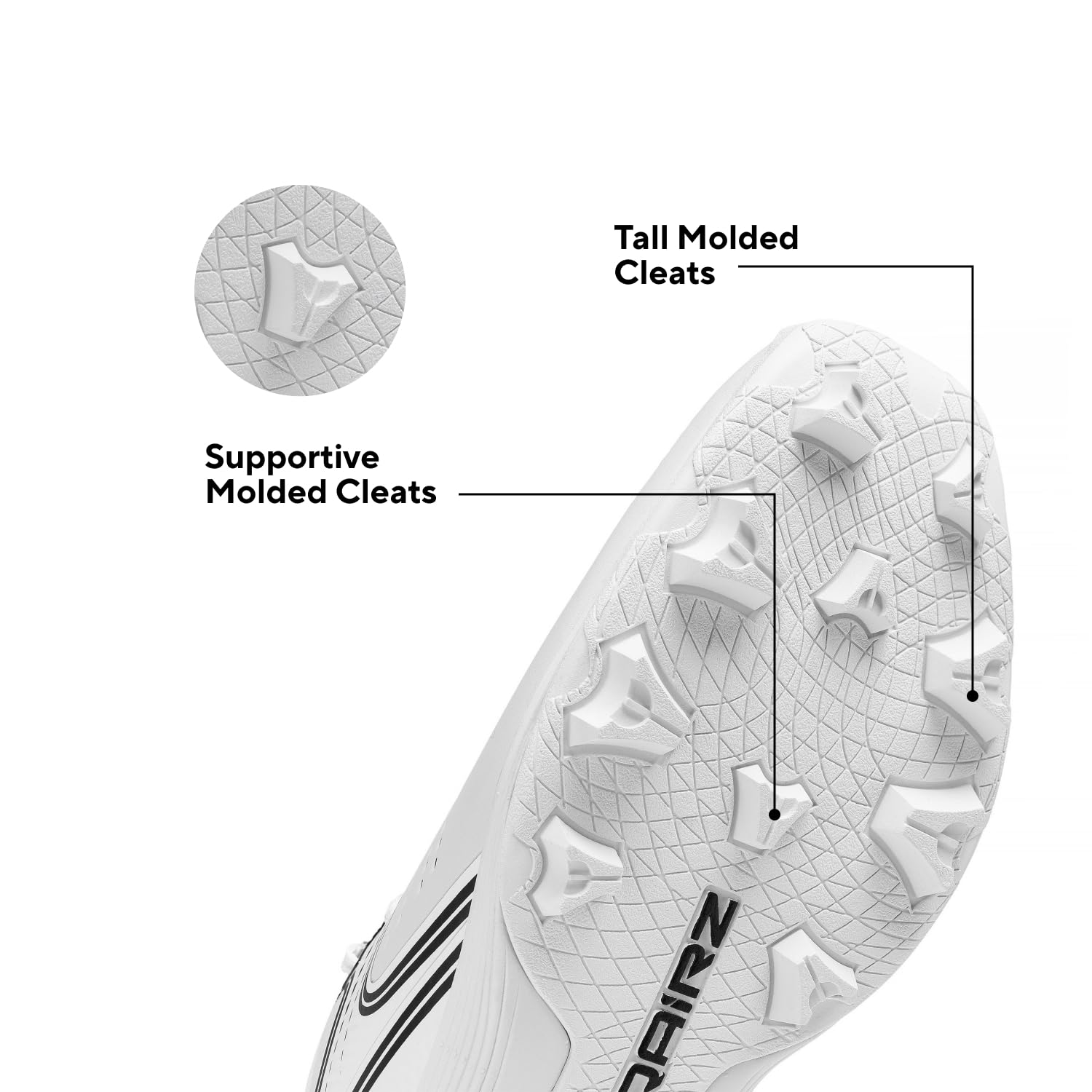 - Improved Ground Contact: This patented molded cleat maximizes foot-to-ground contact, optimizing kinetic energy transfer, which is the fuel for elevated pitching, running, or batting speed. Our rubber molded cleat design provides superior grip, reduce slippage, and deliver the stability you need on both artificial turf and grass surfaces without compromising safety or durability.