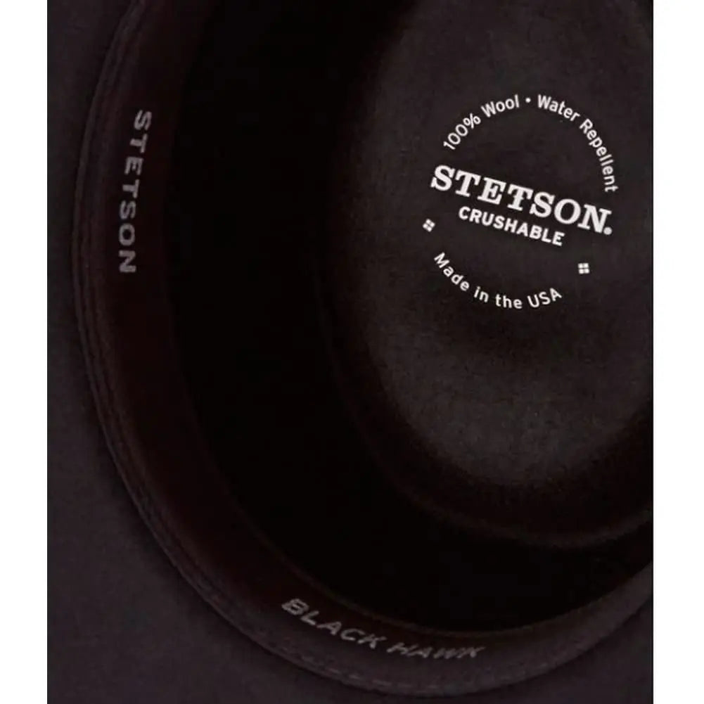 The Black Hawk Outdoor Hat is constructed of crushable wool and features an interior dri-lex sweatband and studded leather hat band. Wool. Made in USA. Brim: 3 1/4" 78 Profile Studded Leather Hat Band Made in U.S.A. 100% Wool DRI-LEX Sweatband Outdoor Collection