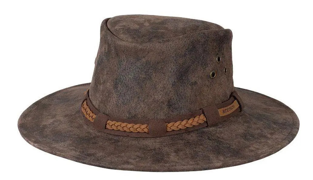Stetson's Canberra Distressed Suede Aussie Hat is an Aussie style wide brim hat constructed of 100% leather and given a suede finish. Detailed with metal grommets, layered leather hat band (partially braided) and a convenient chin cord. Perfect for outdoor adventures!