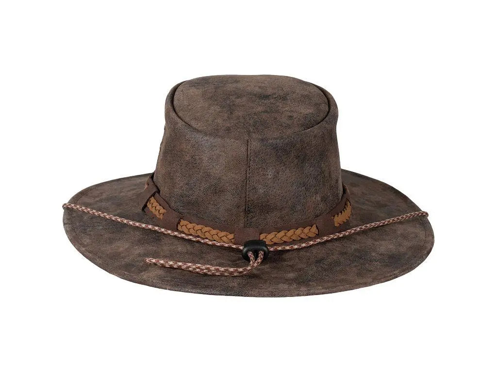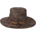 Stetson's Canberra Distressed Suede Aussie Hat is an Aussie style wide brim hat constructed of 100% leather and given a suede finish. Detailed with metal grommets, layered leather hat band (partially braided) and a convenient chin cord. Perfect for outdoor adventures!