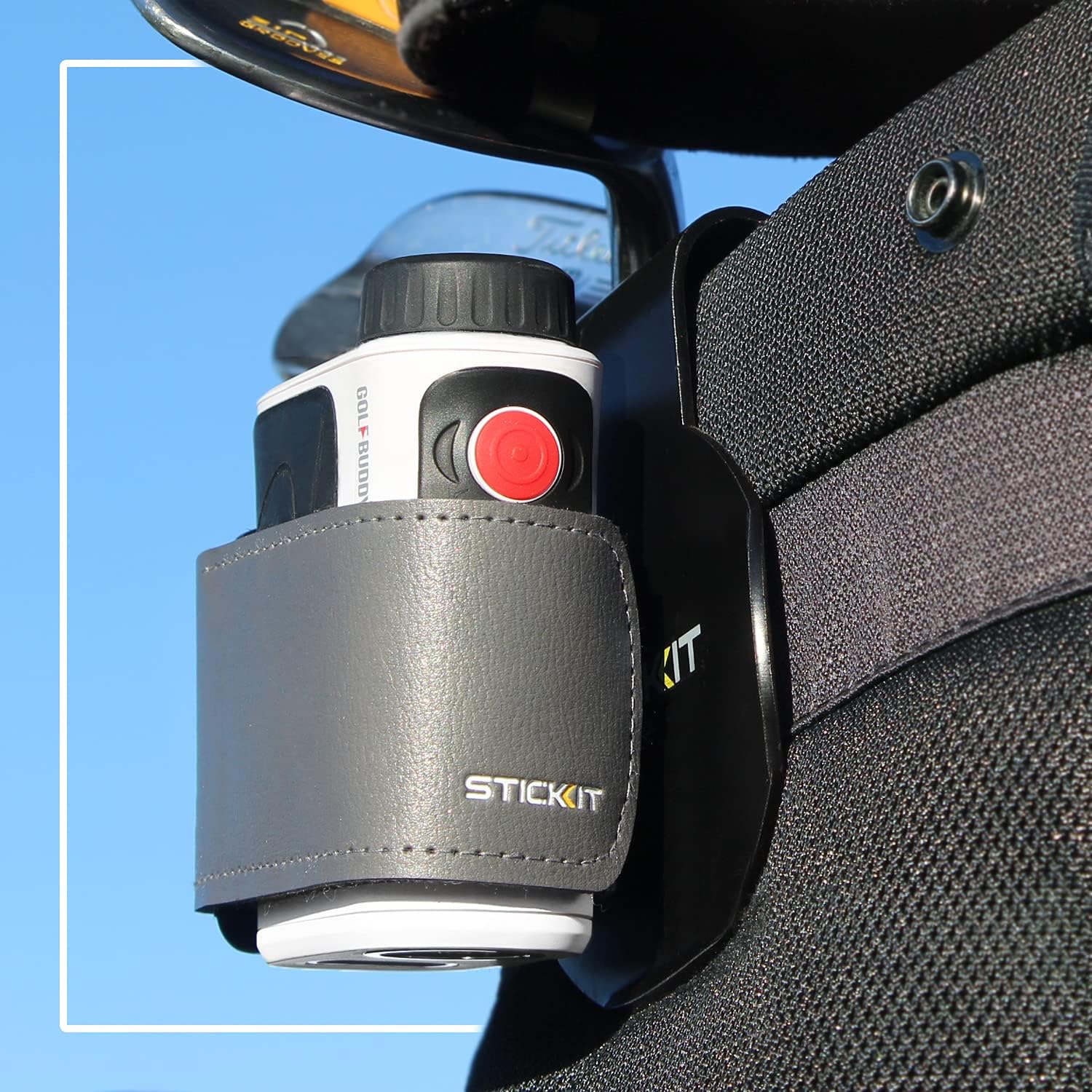 - QUICK ‘N EASY ACCESS ON THE GOLF CART — Magnetically position your rangefinder where you want it! The STICKIT Magnetic Rangefinder Strap securely holds rangefinders to the metal golf cart post and steering column for convenient positioning and constant access every shot — infinitely better than mounts, attachments, drink holders, cubbies, cases or back in the golf bag. It’s a no-brainer for any golfer with a rangefinder.