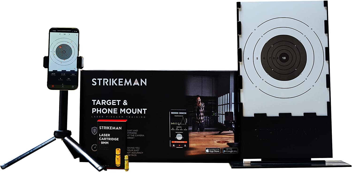 Strikeman is a dry-fire training system that allows you to practice your shooting skills without the need for live ammunition. By using our signature target, laser cartridge and smartphone holder in unison with our phone app, you can safely practice your shot in the comfort of your home.