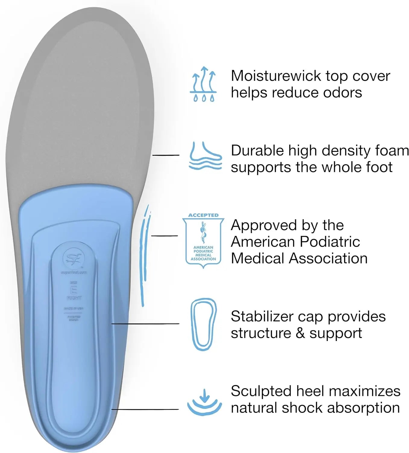 Step into a world of unparalleled comfort and support with Superfeet All-Purpose Support Medium Arch (Blue) Insoles. Designed to enhance the fit and feel of a diverse range of footwear, these remarkable insoles offer long-lasting support in a versatile design. Get ready to experience a whole new level of foot bliss. At the heart of Superfeet All-Purpose Support Medium Arch (Blue) lies its orthotic shape and unwavering support. Crafted with meticulous precision, these insoles provide a reliable foundation for your feet, ensuring long-lasting comfort and reducing fatigue. Say goodbye to discomfort and hello to happy, well-supported feet.It's no surprise that Superfeet All-Purpose Support Medium Arch (Blue) is a perennial favorite among countless individuals. With their impressive track record, you can trust that Superfeet All-Purpose Support Medium Arch (Blue) will elevate your footwear experience to new heights.Plus, get Plantar Fasciitis relief with a stabilizer cap that supports the rearfoot and provides structure and stability to the foam layer.Ease and convenience are key when it comes to Superfeet All-Purpose Support Medium Arch (Blue). Engineered to replace the removable sockliner in roomy to moderate-fitting footwear, these insoles seamlessly integrate into your favorite shoes, bringing a whole new level of comfort to your everyday life. And with the ability to trim them to fit your shoe size, achieving the perfect fit has never been easier.Since 1977, Superfeet has been using innovative materials, cutting-edge technology, and decades of experience in the field of podiatric medicine to create the signature shape that sets Superfeet apart. Superfeet support isn't just about making incredibly comfortable insoles. It's about making a positive difference in people's lives, together creating a happier, healthier world one step at a time.
