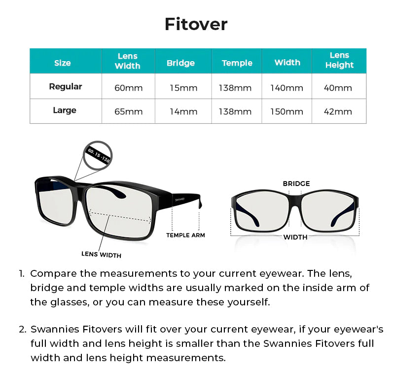 - FITS OVER your FAVORITE EYEWEAR: Swannies Fitovers will fit over your current reading glasses or prescription glasses as long as your eyewears full width and lens height is smaller than the Swannies Fitovers full width and lens height measurements.
