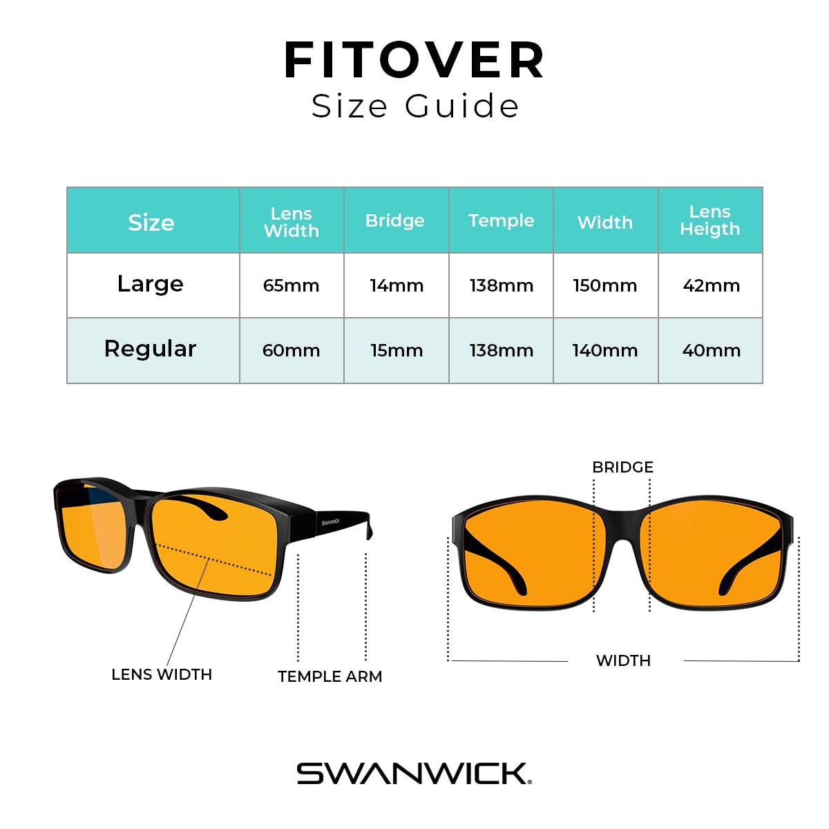 - FITS OVER your FAVORITE EYEWEAR: Swannies Fitovers will fit over your current reading glasses or prescription glasses as long as your eyewears full width and lens height is smaller than the Swannies Fitovers full width and lens height measurements.