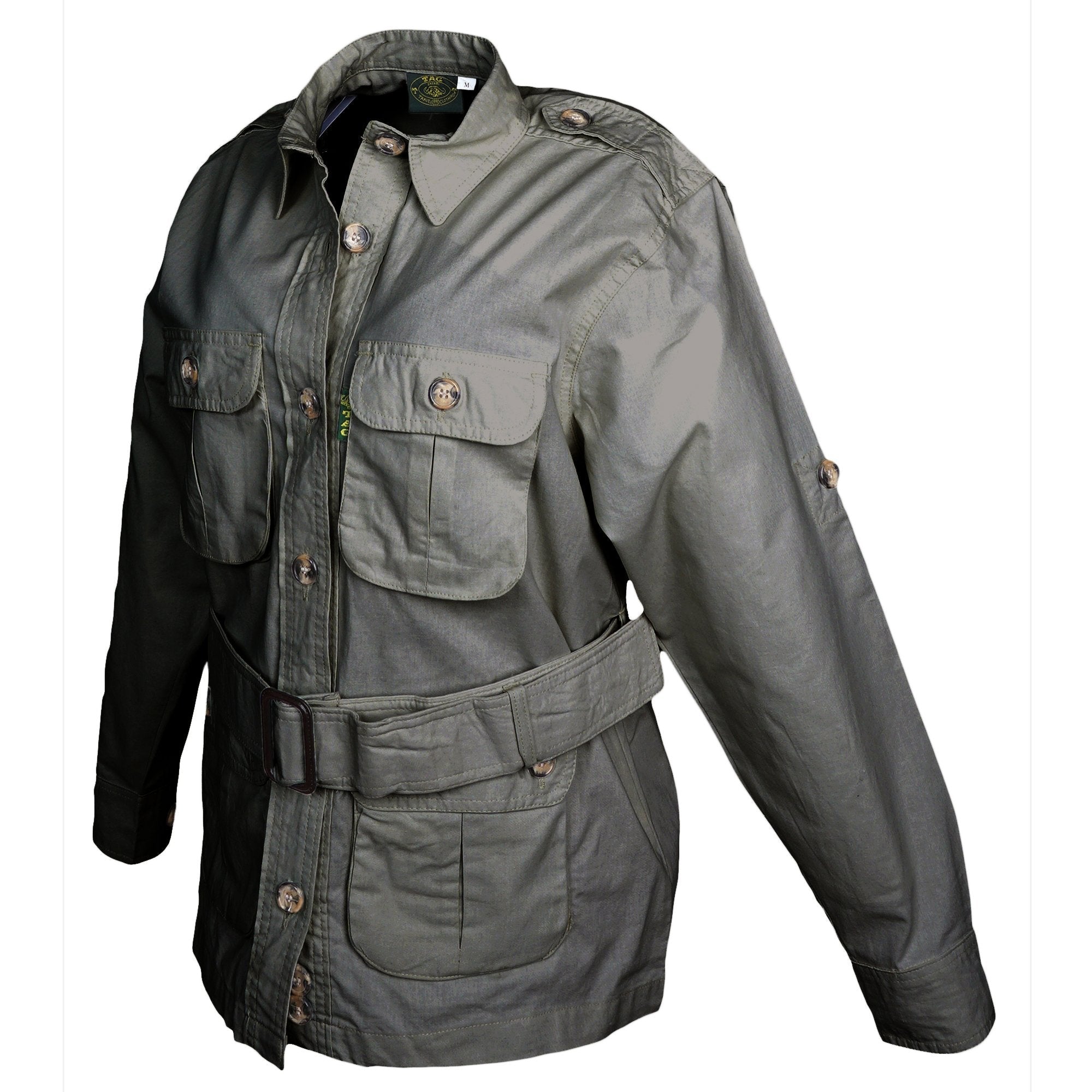 Safari Jacket for women is an authentic African original made from light weight 5 1/2 ounce cotton fabric. Layer over a T-shirt or hunting shirt for cool comfort. Two buttoned flap covered chest pockets and two cargo pockets at the waist provide ample storage for essential outdoor gear. Cross-stitched epaulettes keep a pair of binoculars or a canteen from sliding off your shoulder. Functional Swiss tabs keep sleeves neatly rolled up. Full buttoned front and belted waist for a classic safari look. Not your grandfather's heavy jacket. Made in Africa from garment washed and pigment dyed cotton. Generously sized for comfort. Worn alone or over other clothing, this womens safari jacket is the real deal and the choice of explorers, guides, and big game hunters the world over.