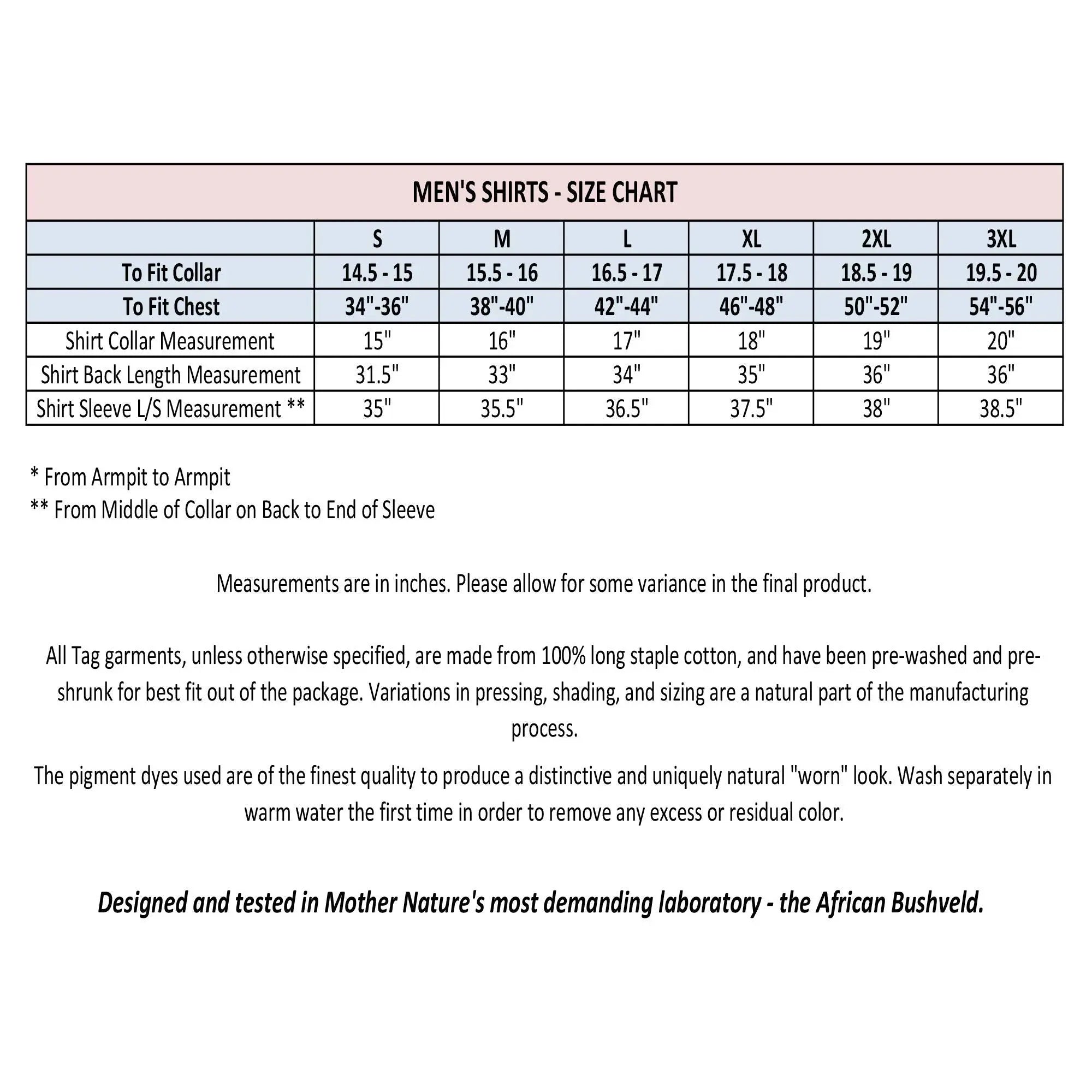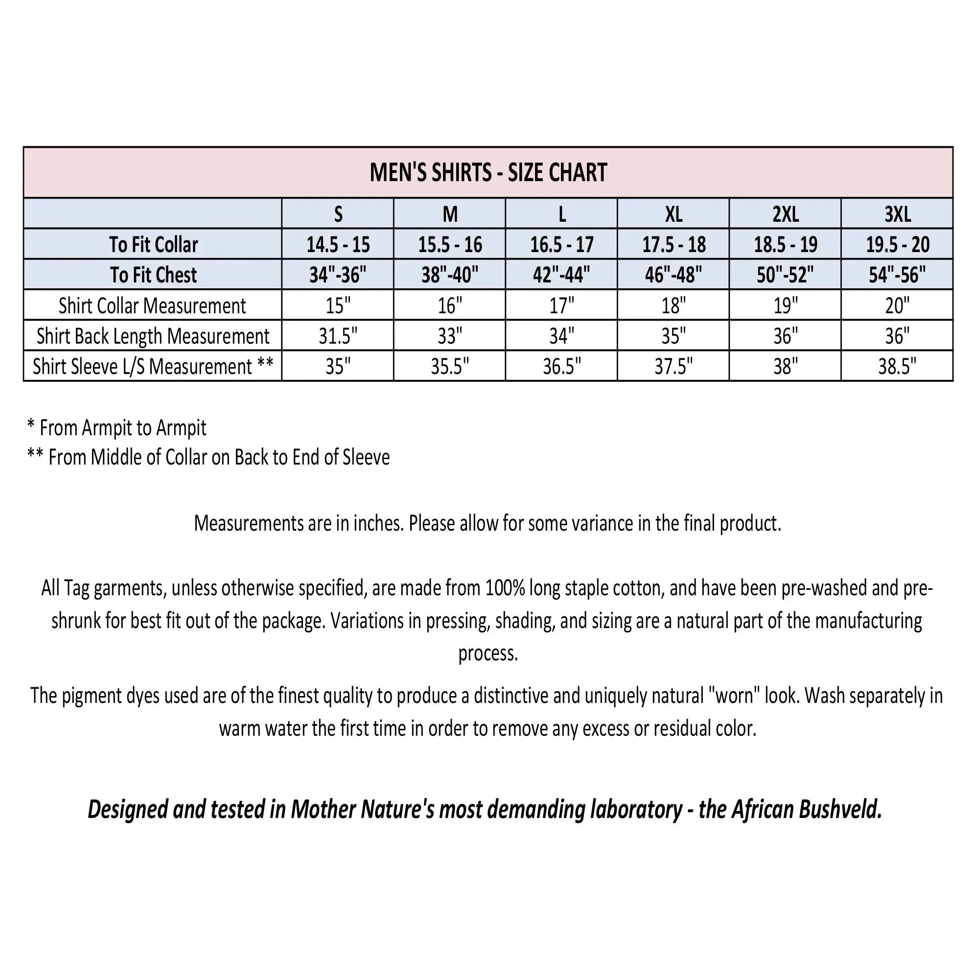 Vented Back Adventure Shirt for men in short sleeves is the ideal safari shirt for your African outdoor travel experience. The mesh lined vent back circulates air to keep you cool. Two chest pockets with button down flaps carry essential outdoor gear. Safari style roll up tabs add a classic finishing touch to the sleeves. Button down collars stop the wind from blowing collar points in your face. Double stitched throughout for durability, with generous sizing and long tails that stay tucked in. Made in Africa from 5 1/2 ounce pre-washed and pigment dyed cotton for a natural worn look.