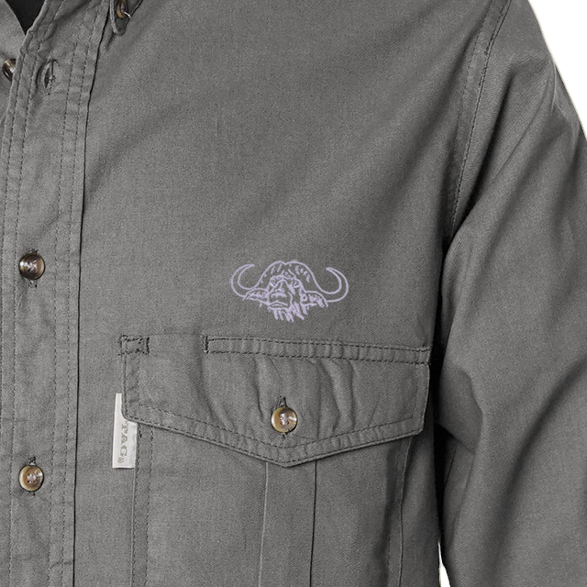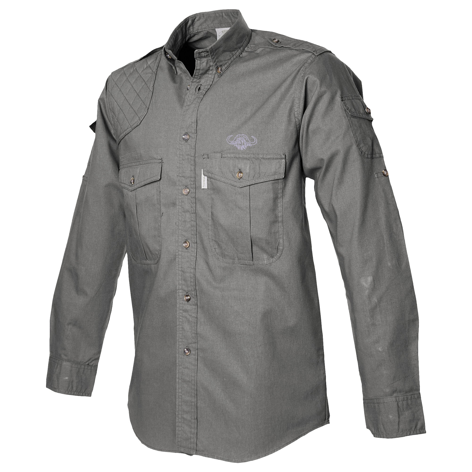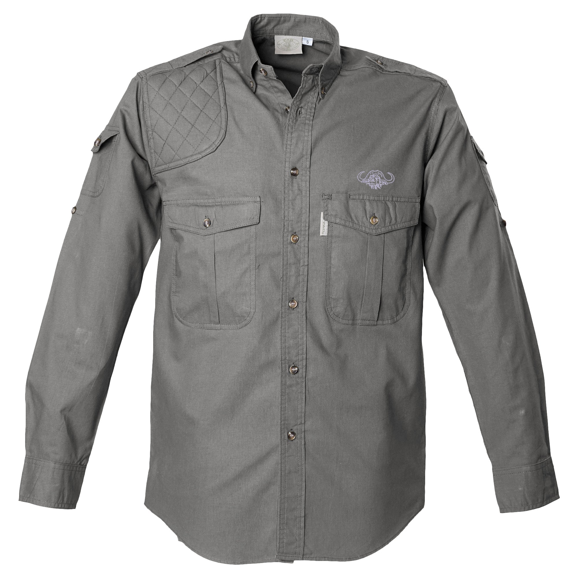 Shooter Shirt for men in long sleeves, with shooting patch and shoulder epaulettes, is an authentic African big game safari shirt inspired by great hunters such as Courtney Selous. The diamond quilted shooter patch effectively cushions gun recoil. Two pleated chest pockets with button down flaps carry essential hunting gear. Two smaller pockets with button down flaps on the sleeves hold ammo and other needed supplies. Functional cross-stitched epaulettes prevent a gun sling or binoculars from slipping off your shoulder. Button down collars stop shirt collar points from striking your face when hunting on windy days. Double stitched throughout for durability, with generous sizing and long tails that stay tucked in. Made in Africa from rugged, lightweight 5 1/2 ounce cotton for cool comfort. This men?s short sleeved shooting shirt was made for your ultimate safari experience.