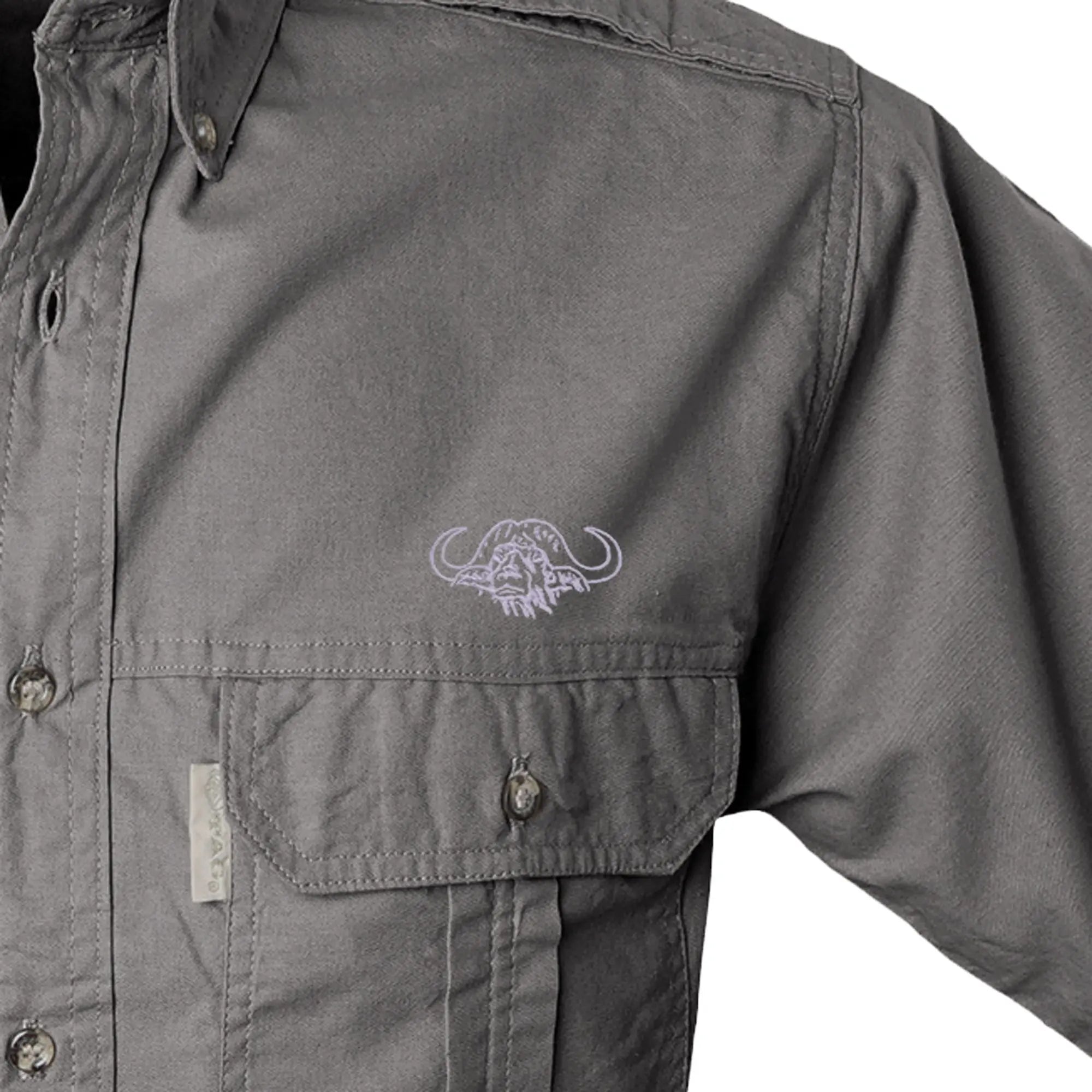 Trail Shirt for men in short sleeves with the Tag buffalo logo embroidered on the left side, is a classic outdoor shirt and perfect for hiking the African savanna. Two chest pockets with button down flaps carry essential outdoor gear. Functional cross-stitched epaulettes prevent a camera or water canteen from slipping off your shoulder. Button down collars stop the wind from blowing collar points in your face. A double layered back yolk gives extra sun protection while two back tucks allow extra shoulder swing. Double stitched throughout for durability, with generous sizing and long tails that stay tucked in. Made in Africa from pre-washed and pigment dyed 5 1/2 ounce cotton for a natural worn look. This mens short sleeved safari trail shirt with the Tag Safari Buffalo logo will be a welcome travel companion on any adventure.