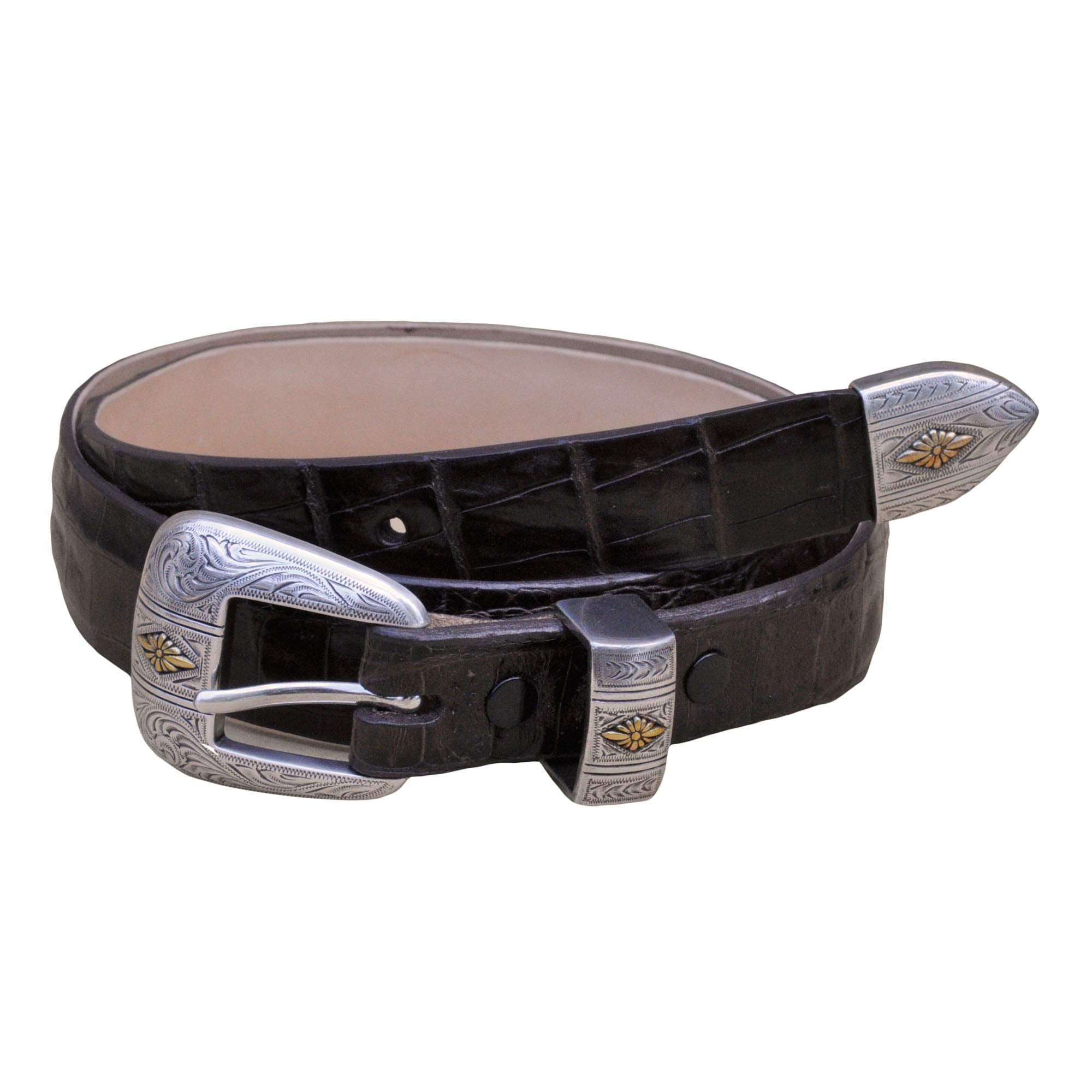 - Alligator Safari Belt - 1" Wide on the Tapered Ends, 1 1/4" Wide on the Main Body - Stylish Silver Plated Engraved Buckle and Matched Fittings - Genuine Leather - Made In USA