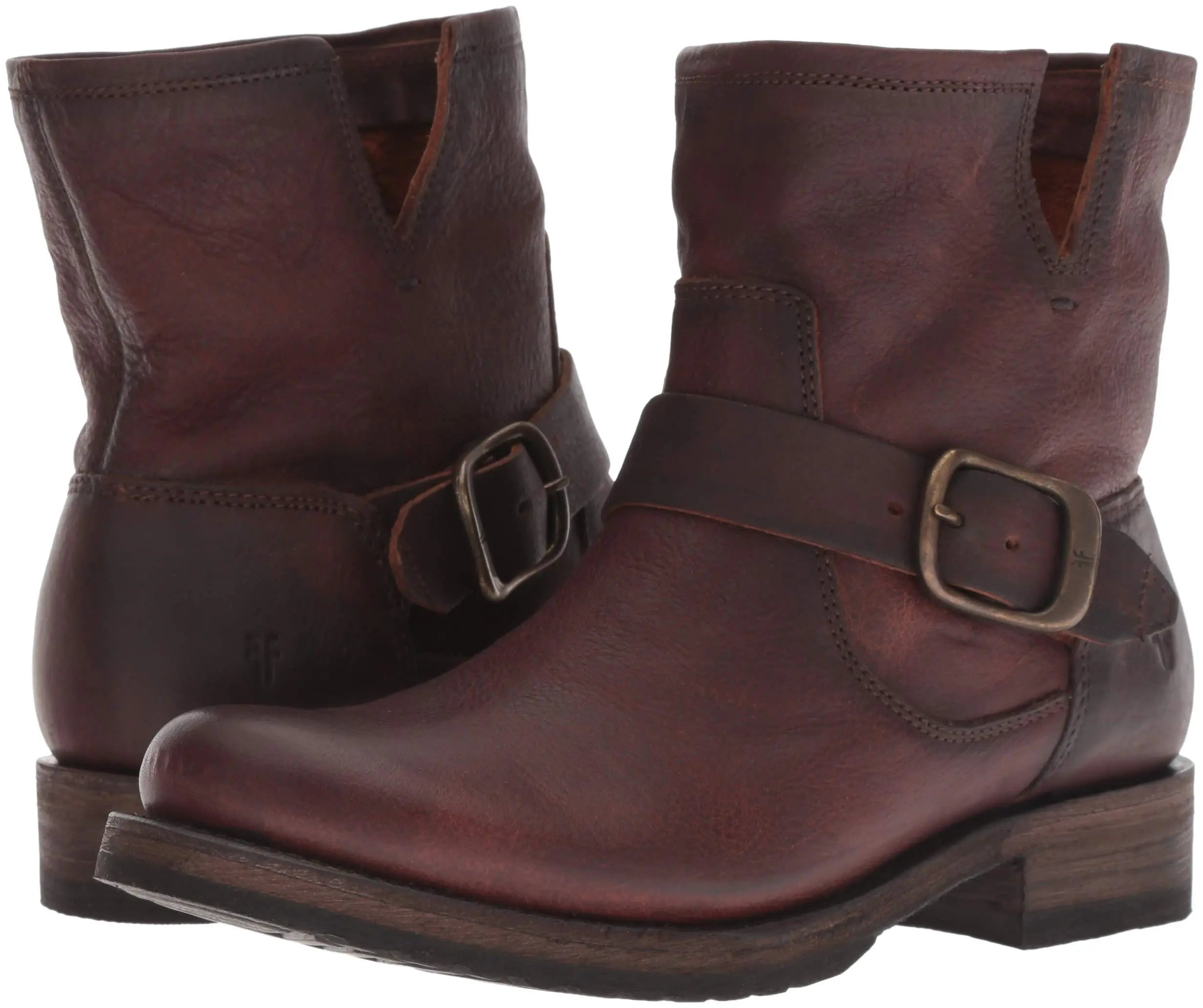 "The Frye Company For more than 153 years, Frye craftsmen have been dedicated to the art of shoemaking, creating modern patterns, discovering materials and even inventing machinery. Rooted in authentic American heritage, The Frye Company uses the best leathers, designs and innovations in the pursuit of timeless, artisanal style. Frye boots were worn by soldiers on both sides of America's Civil War, soldiers in the Spanish-American war, and by Teddy Roosevelt and his Rough Riders. When homesteading drew adventurous New England families to the West during the mid and late 1800's many of the pioneers wore Frye Boots for the long journey. Today Frye remains true to its roots with its line of heritage boots, but continues to innovate as it introduces chic new handbags, pumps, and sandals to its collection. Fryes mission, to make iconic leather goods that endure, has remained unchanged throughout its storied history. Veronica Bootie We're not exactly sure what it is, but there's something about the Veronica style that gives you a boost and well, attitude. Whatever it is, we know magic when we see it. Trust us. Take these buckle booties, for example, crafted from washed and oiled vintage leather, they have hand-stitched Goodyear welt soles that are durable and waterproof. The finished ankle boots for women are then treated with a heavy acetone wash that is hand antiqued and polished to give each pair a two-tone, worn finish effect."