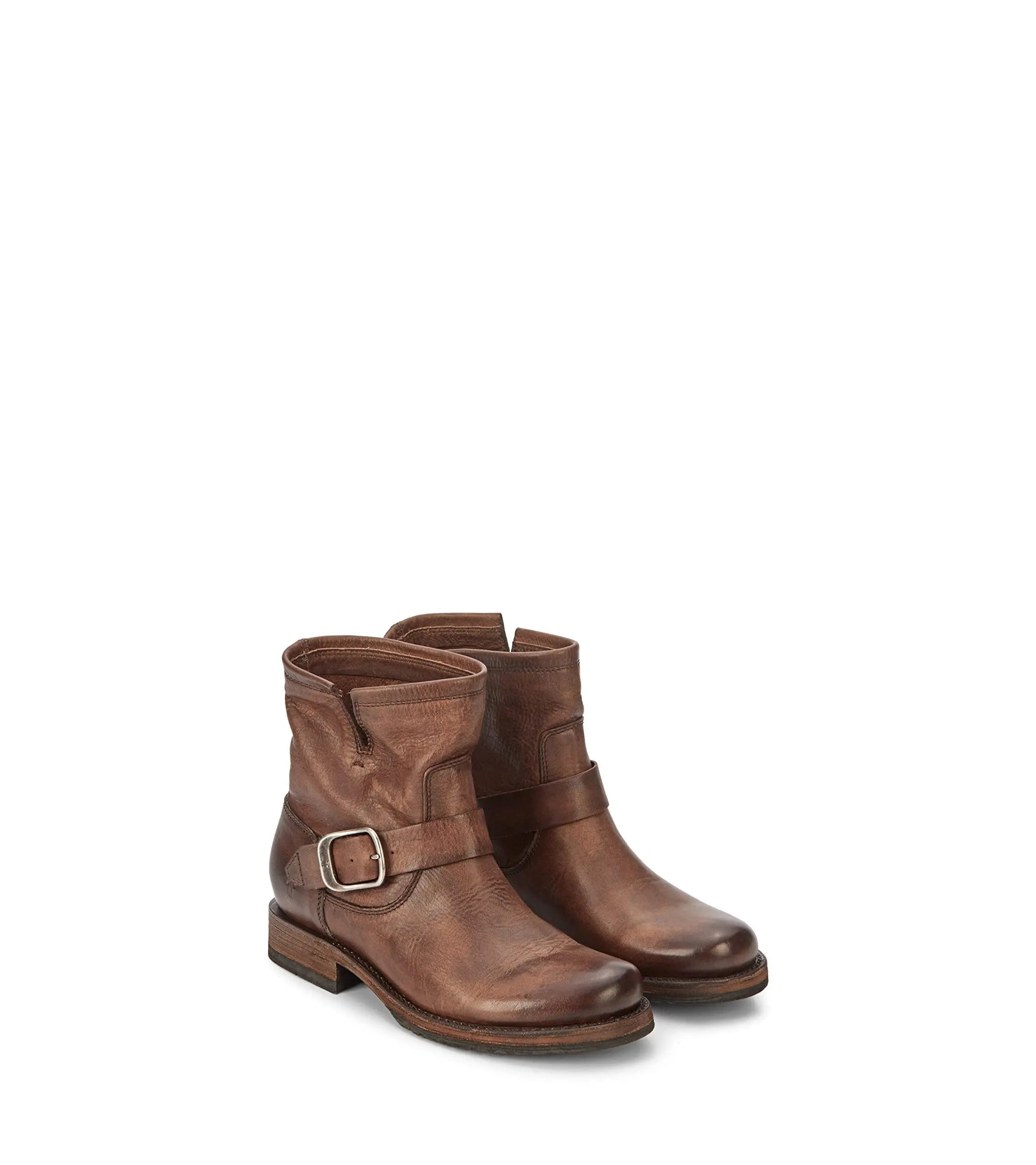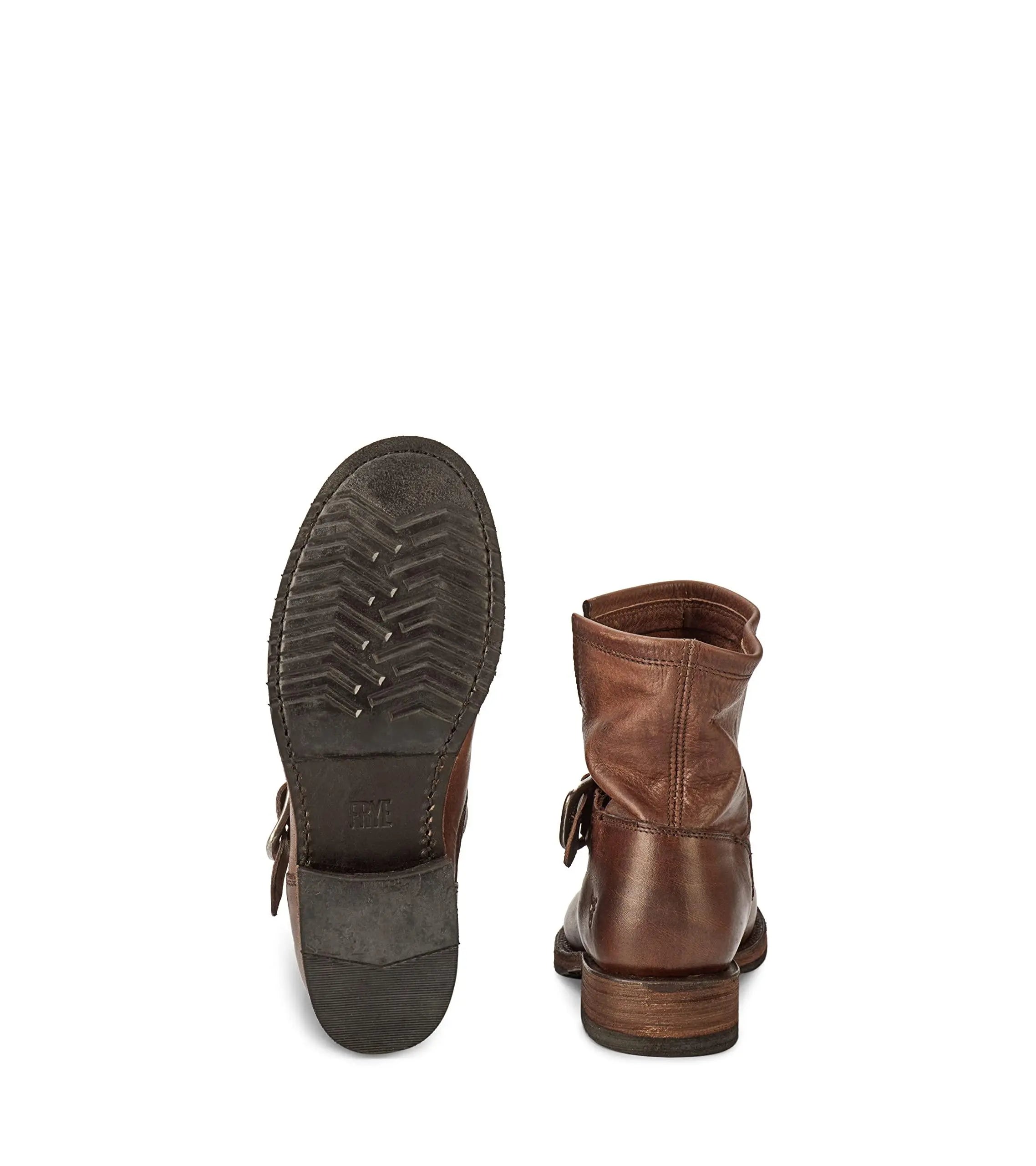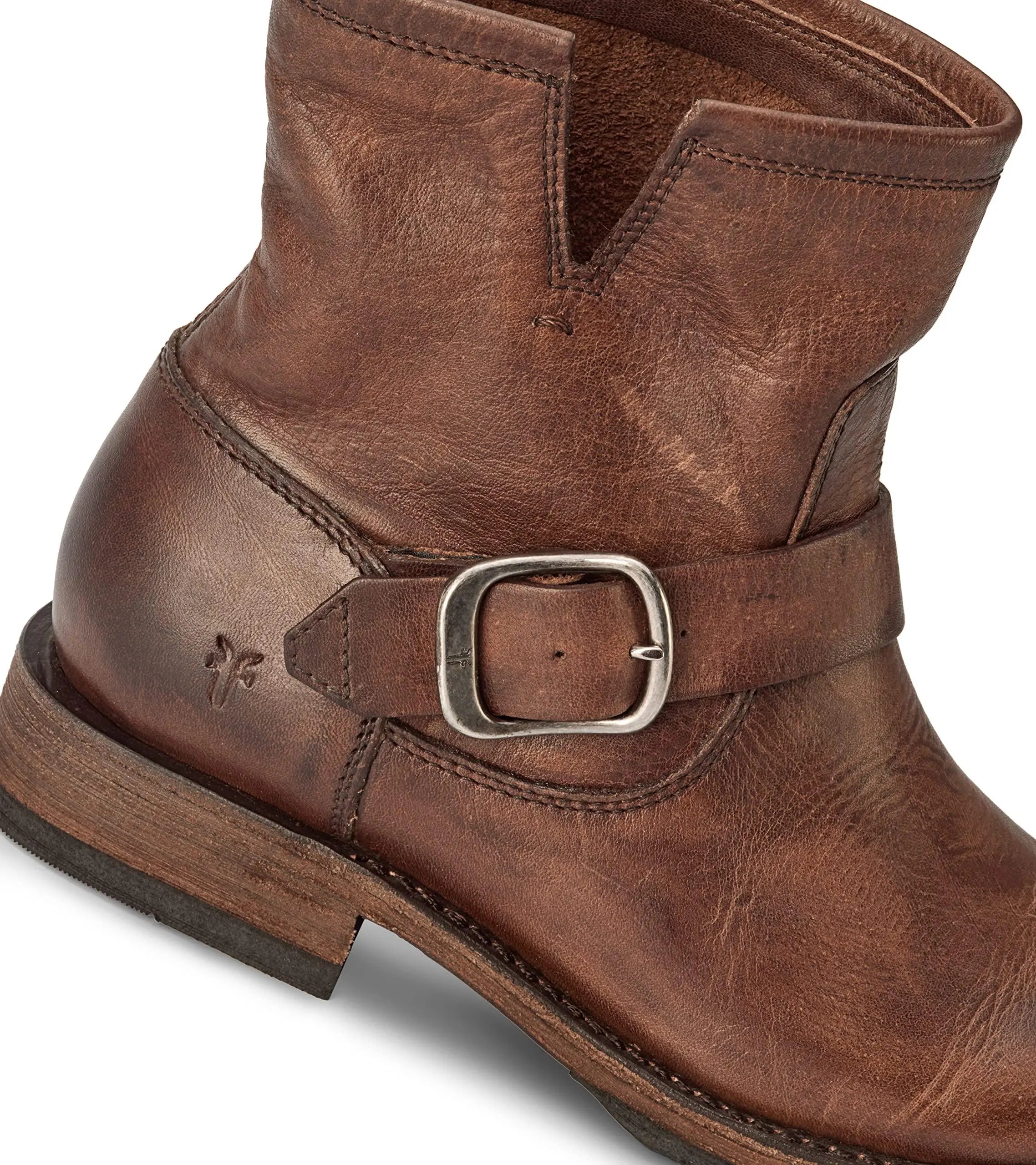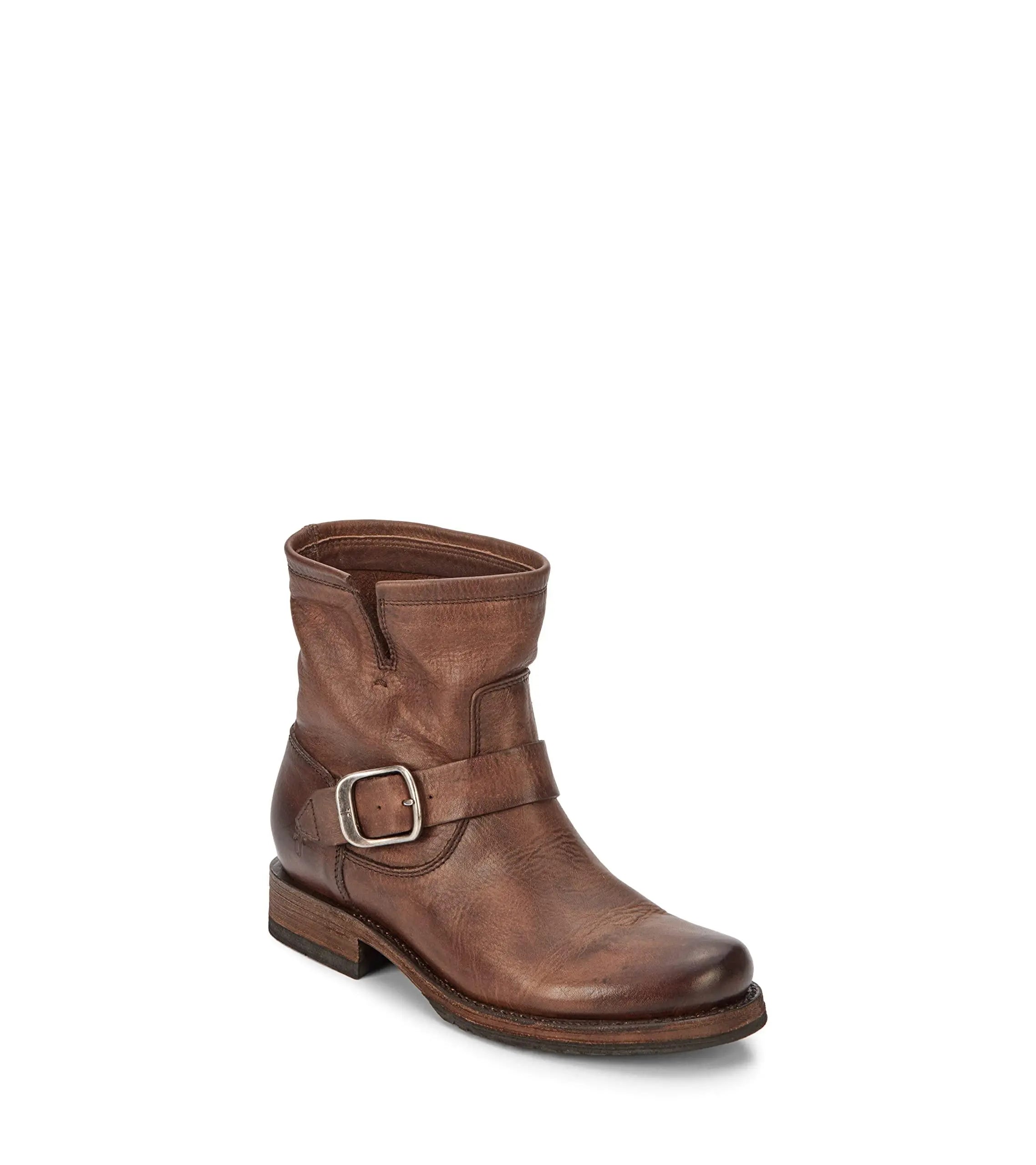 "The Frye Company For more than 153 years, Frye craftsmen have been dedicated to the art of shoemaking, creating modern patterns, discovering materials and even inventing machinery. Rooted in authentic American heritage, The Frye Company uses the best leathers, designs and innovations in the pursuit of timeless, artisanal style. Frye boots were worn by soldiers on both sides of America's Civil War, soldiers in the Spanish-American war, and by Teddy Roosevelt and his Rough Riders. When homesteading drew adventurous New England families to the West during the mid and late 1800's many of the pioneers wore Frye Boots for the long journey. Today Frye remains true to its roots with its line of heritage boots, but continues to innovate as it introduces chic new handbags, pumps, and sandals to its collection. Fryes mission, to make iconic leather goods that endure, has remained unchanged throughout its storied history. Veronica Bootie We're not exactly sure what it is, but there's something about the Veronica style that gives you a boost and well, attitude. Whatever it is, we know magic when we see it. Trust us. Take these buckle booties, for example, crafted from washed and oiled vintage leather, they have hand-stitched Goodyear welt soles that are durable and waterproof. The finished ankle boots for women are then treated with a heavy acetone wash that is hand antiqued and polished to give each pair a two-tone, worn finish effect."
