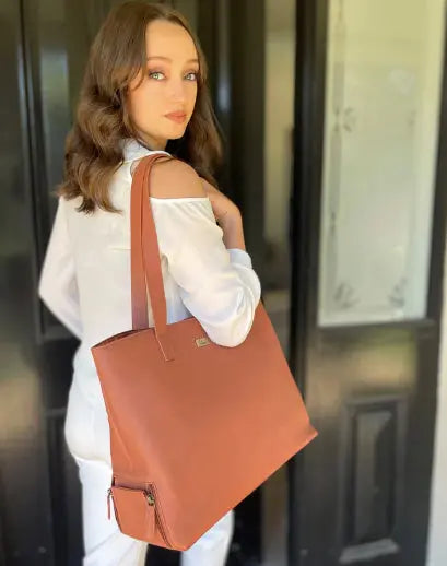 Beautiful leather tote with a concealed, insulated wine bottle pocket from Tilvini.