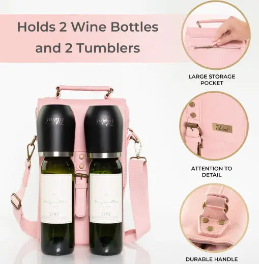 - UNIQUE WINE GIFTS FOR WOMEN that like stylish wine accessories. The Tilvini leather wine bag carries 2 wine bottles & wine tumblers and is insulated, creating the perfect picnic gift set. This wine cooler bag makes a beautiful beach tote, picnic basket for 2, bartender bag or even boating gift. No need to carry that bulky picnic basket, cooler backpack, insulated lunch bag or picnic backpack on your next outing, get yourself a Tilvini wine bag for your wine bottles and sip wine in style!