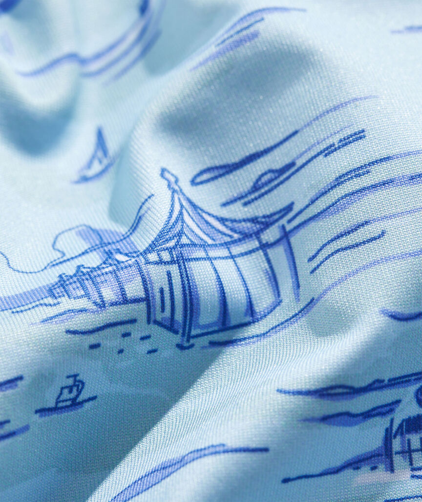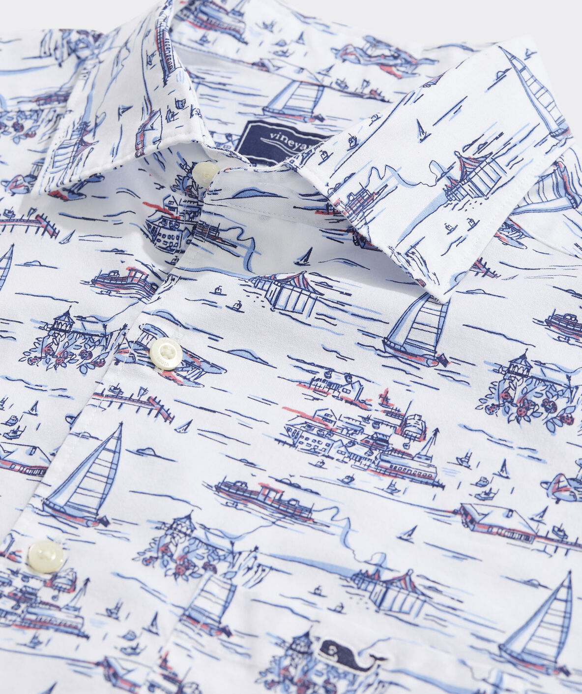 We've been giving the gift of the Vineyard to fans for 25 years. This soft stretch cotton poplin short-sleeve shirt is just the latest example. The print showcases many of our favorite sights around Edgartown, our hometown on the island.